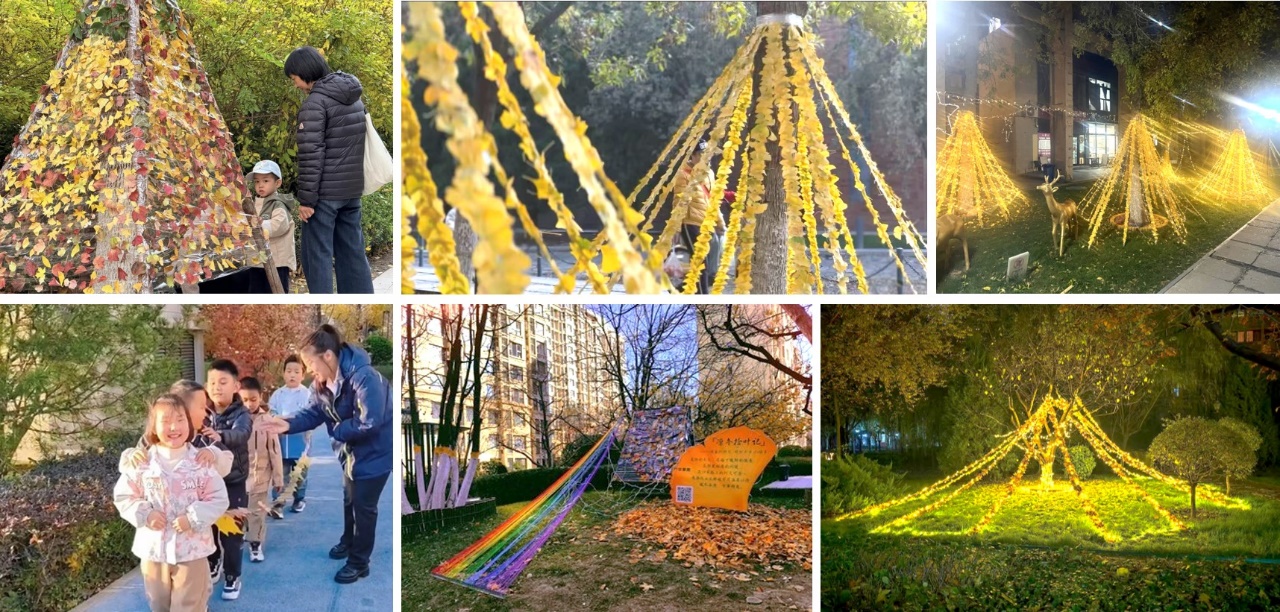 落叶在各个小区绽放别样精彩:东第家园打造梦幻“落叶圣诞树”,水晶城、溪水园和秀江园用落叶编织出飘逸的“金丝帘”,翡翠嘉和组织业主一起做“立体银杏花”,西华府的落叶“魔法帽”为孩子们打造童话快乐;美坪园将落叶与彩虹拉网结合做网红打卡点,还把园区改造历史封存在带二维码的银杏叶中;瑞鸿名苑管家带领孩子们玩起“落叶版贪吃蛇”游戏,假日风景的管家与业主阿姨们踩着落叶共舞,暖心场景频频上演。