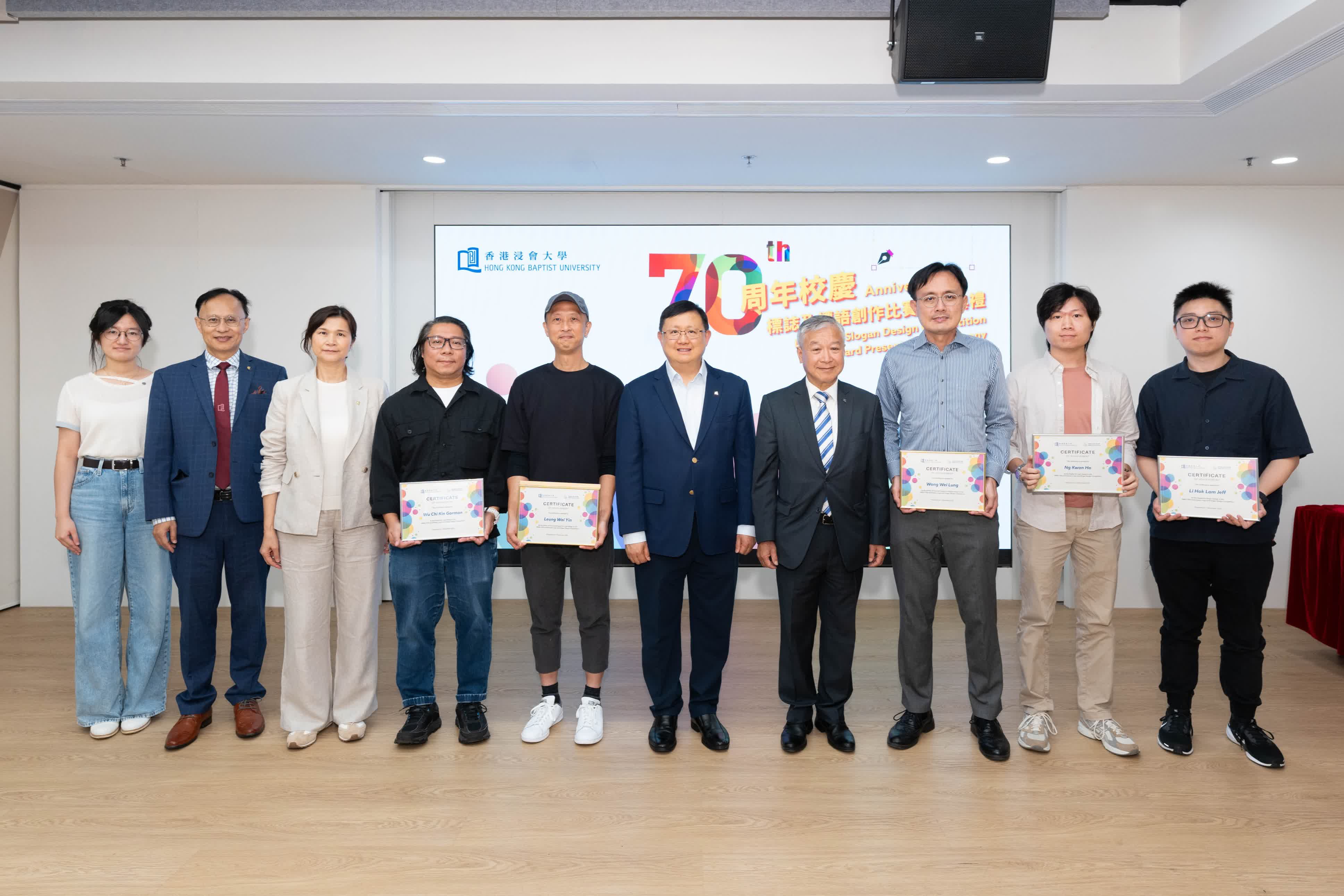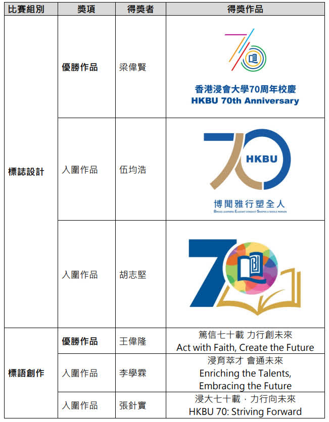 擔任評審團主席的浸大校董會暨諮議會副主席潘偉賢讚揚參加者充滿創意,作品別出心裁,展示出浸大社群及其支持者才華洋溢。標誌設計的優勝作品生動地展現浸大在教學、研究和人文的活力。七彩繽紛的線條代表着浸大七個學院及校園社群;充滿動感的弧線象徵大學持續力臻卓越的精神。整體設計寓意浸大迎向充滿機遇與無限可能的未來;至於標語創作的優勝作品「篤信七十載 力行創未來」(Act with Faith, Create the Future),作品工整簡單,呼應浸大「篤信力行」的校訓,致力於教育、研究及服務社會,締造積極創新的未來。