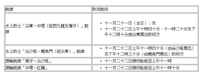 博覽道交界以北位於金紫荊廣場外的一段博覽道東(包括上/落客區)將於11月22日凌晨零時30分至下午1時臨時封閉;及灣仔香港會議展覧中心(會展)梯台及九龍公眾碼頭第1號至4號的登岸梯級將由11月21日上午9時至11月22日下午1時期間分階段封閉。