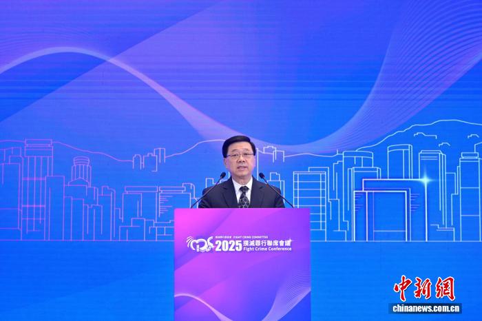图为香港特区行政长官李家超在“2025扑灭罪行联席会议”上致辞。 (香港特区政府新闻处供图)