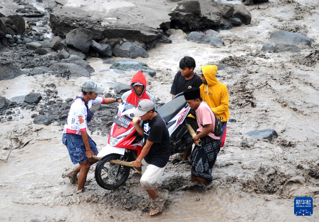 11月23日,在印度尼西亚东爪哇省,人们抬着摩托车穿过被火山灰覆盖的河滩。