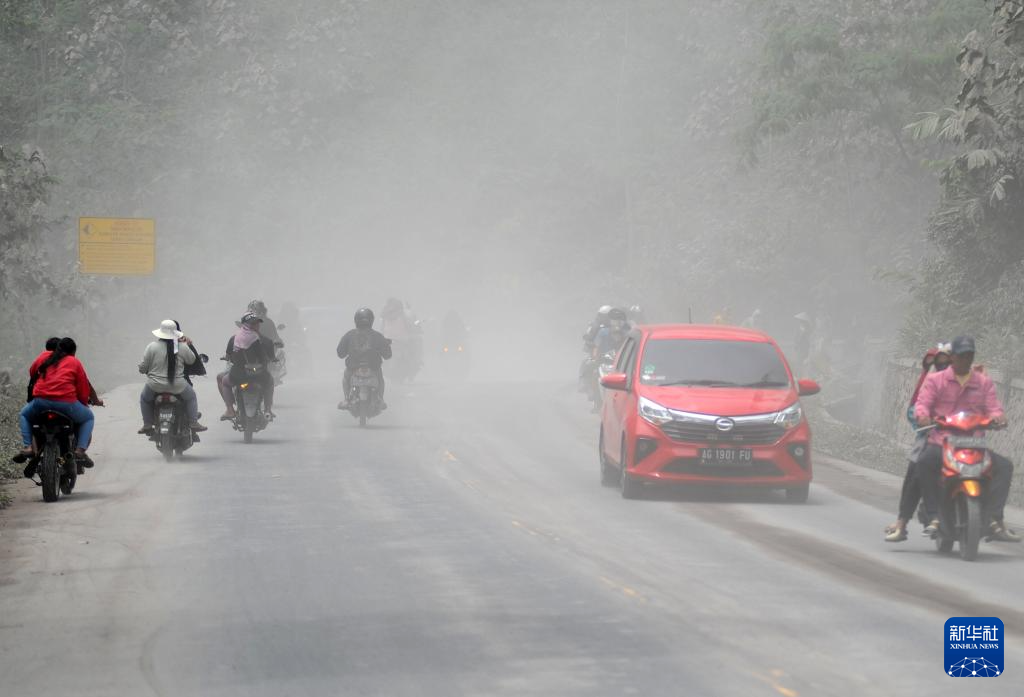 11月23日,在印度尼西亚东爪哇省,人们在弥漫的火山灰中出行。