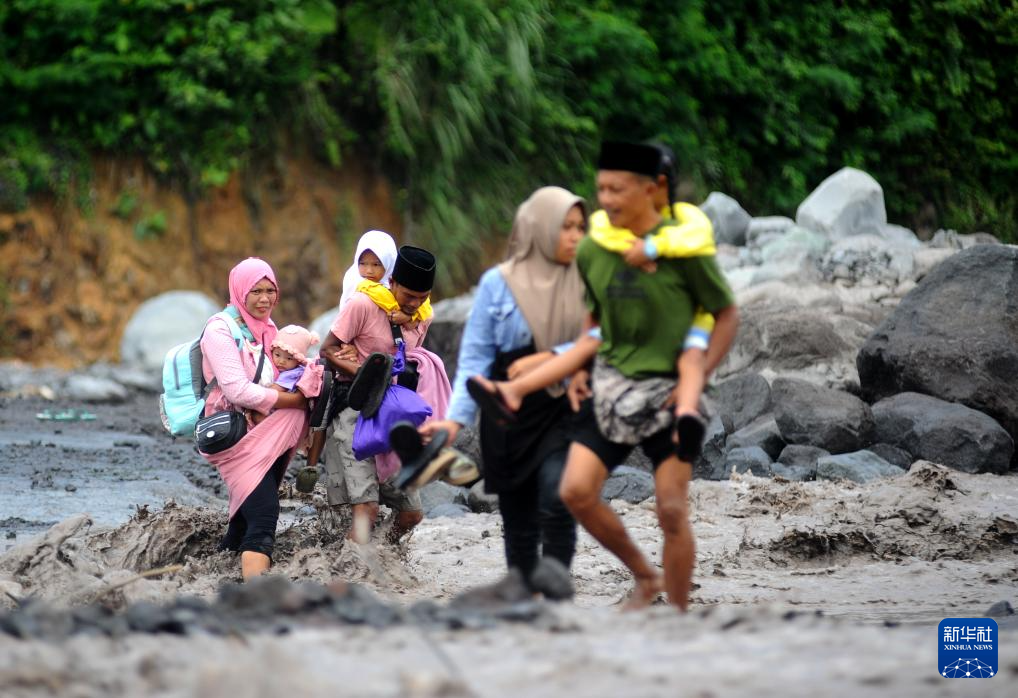 11月23日,在印度尼西亚东爪哇省,人们穿过被火山灰覆盖的河滩。