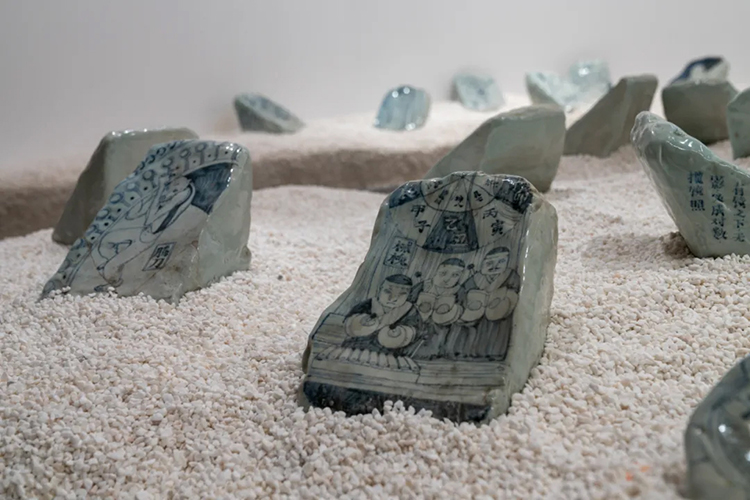 第三个展区的《百神斗术碑》是文那早期在景德镇耗时一个多月所创作的陶瓷作品,108位神仙,各显神通,列阵斗法。墙面上的72位传统神仙与地面上的36位文那创作的“野生神仙”,传统与新创融合一起,光怪陆离,亦真亦幻。
