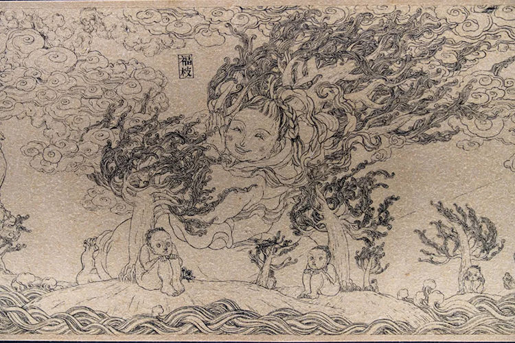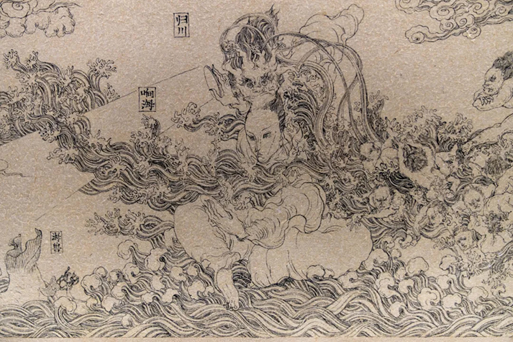 《暗道图•择木图》是文那尝试用长卷形式进行创作的作品,在连续不断的构图之中,她笔下的神仙们仿佛获得了有机生长的空间,它们向前行进,逐渐衍生出属于自己的故事。