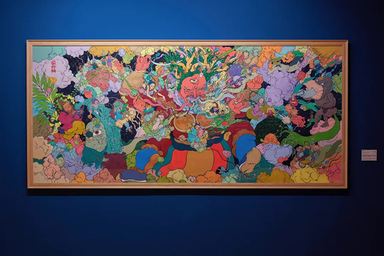 在展厅一楼最后的一个空间,展出的是文那对中国十大经典古画中的《韩熙载夜宴图》的再创作作品——《韩熙载宴仙图》。画作通过虚幻的场景和隐秘的叙事,呈现一个既令人惊叹又疑惑的仙宴世界。