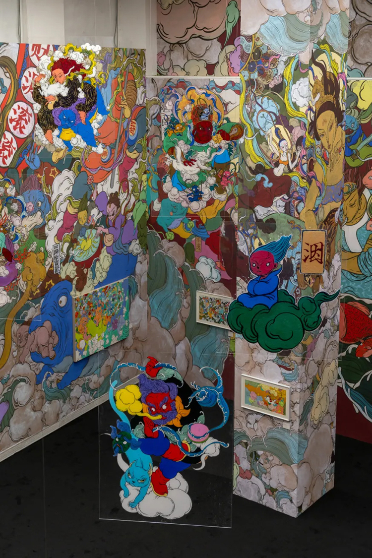 展厅最大空间呈现的是文那多年来创作的神仙形象,这些形象源自壁画、卷轴、架上绘画和年画等原有媒介,此刻悬浮空中,犹如敦煌飞天。观众步入其中,恍如偶然窥见一方“野生神仙”逍遥挥洒、各显神通的神奇世界。