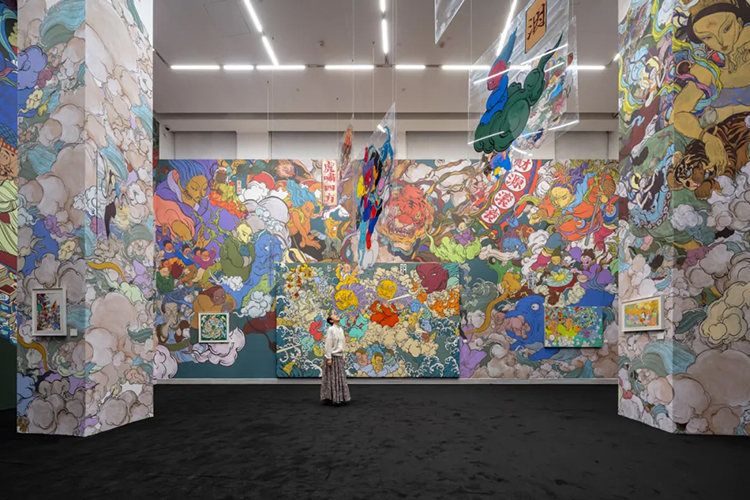 展厅的第一件作品是文那为此次展览创作的《疆野图》。这幅作品就像文那的一张大“创作地图”,她将所有自己创作过的神仙和形象都画在了这张画里:画中主神嘴里“吐”出的像云彩一样的路,是文那走过的不同道路和经历,包括她画的壁画、各种跨界合作、在欧洲走过的国家和所做项目等。那些随着时光流逝可能会消失的墙壁、可能被搬走的雕塑,都永远地留在了这一幅画里,这是一张会随着文那未来的创作被持续填充的未完结的地图。