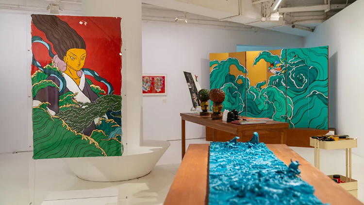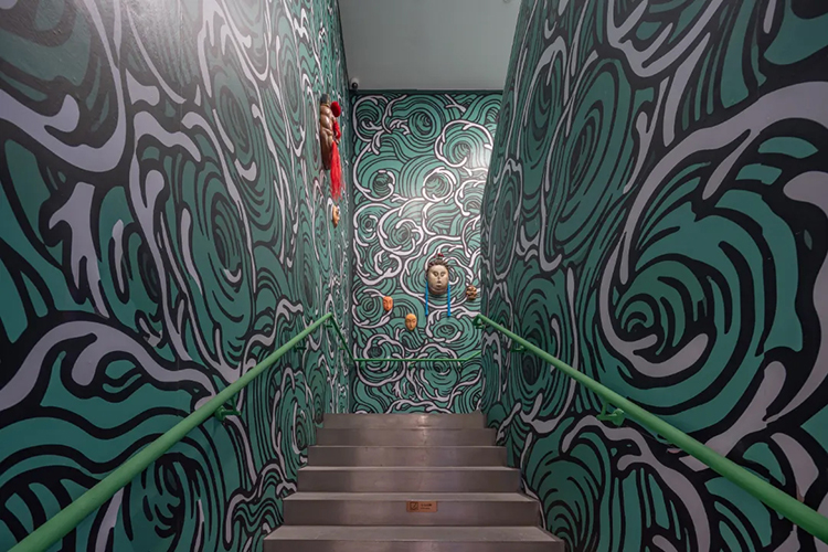 展厅一楼走向二楼的楼梯被打造成一个海浪翻涌的世界,诸多神仙面孔在海浪中穿行。