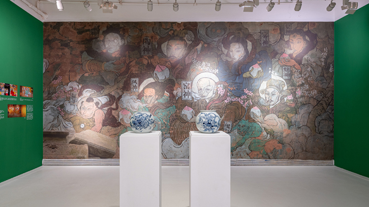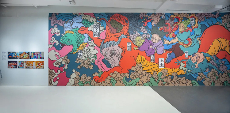 一楼的第四个展厅主要呈现文那的壁画作品,在这里,文那选了两幅最具代表性的作品做大型墙面还原。《三宝赋》是文那在三宝画的最大的一面墙,讲的是三宝所处的自然环境;《狮子龙图》是文那受法国当代艺术博物馆之邀创作的作品,里昂的名字意为“狮子”,文那则从中国带来一条龙,融合成这幅《狮子龙图》。