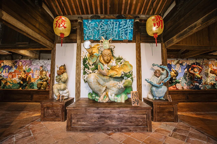 《藏海厝》是坐落在泉州晋江的一个真实的空间,也是文那近五年来最大的项目。该空间里有20多个木雕和1幅巨大的壁画,它讲述了一个关于海上丝绸之路、关于侨民和海洋的故事。在本次展览的二楼镜面空间内,文那把这些形象都做了1/2的处理后重新展示。