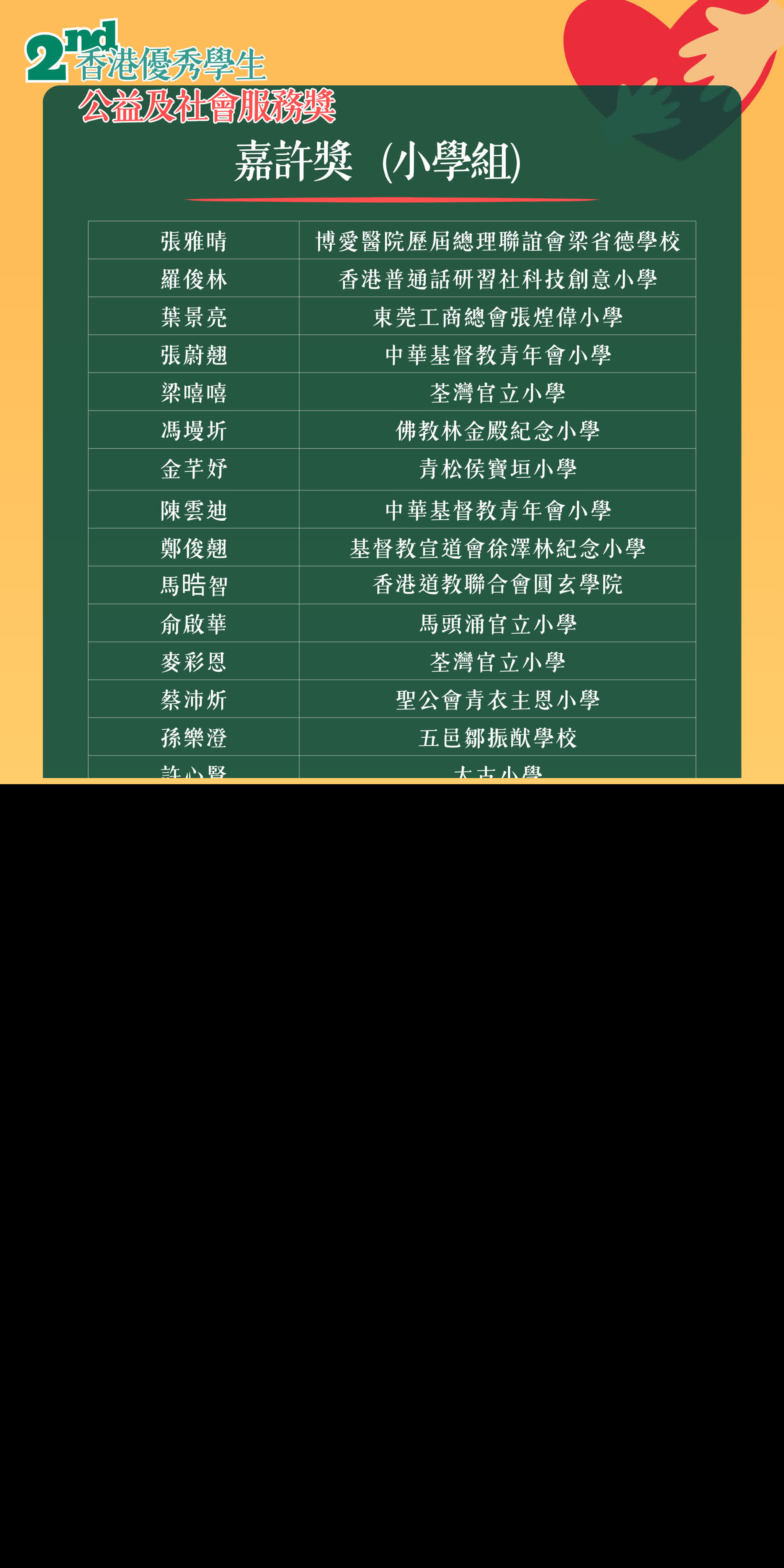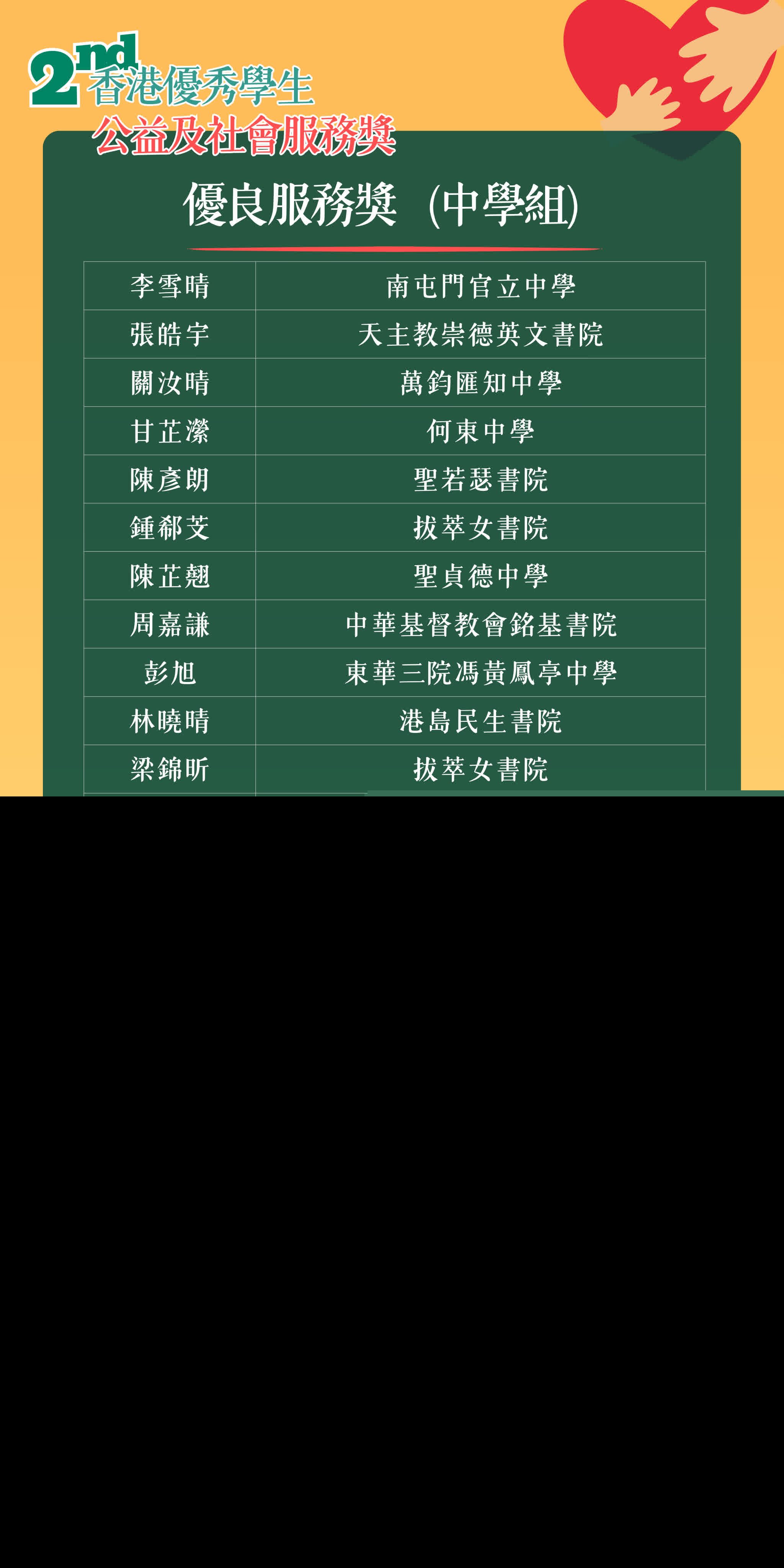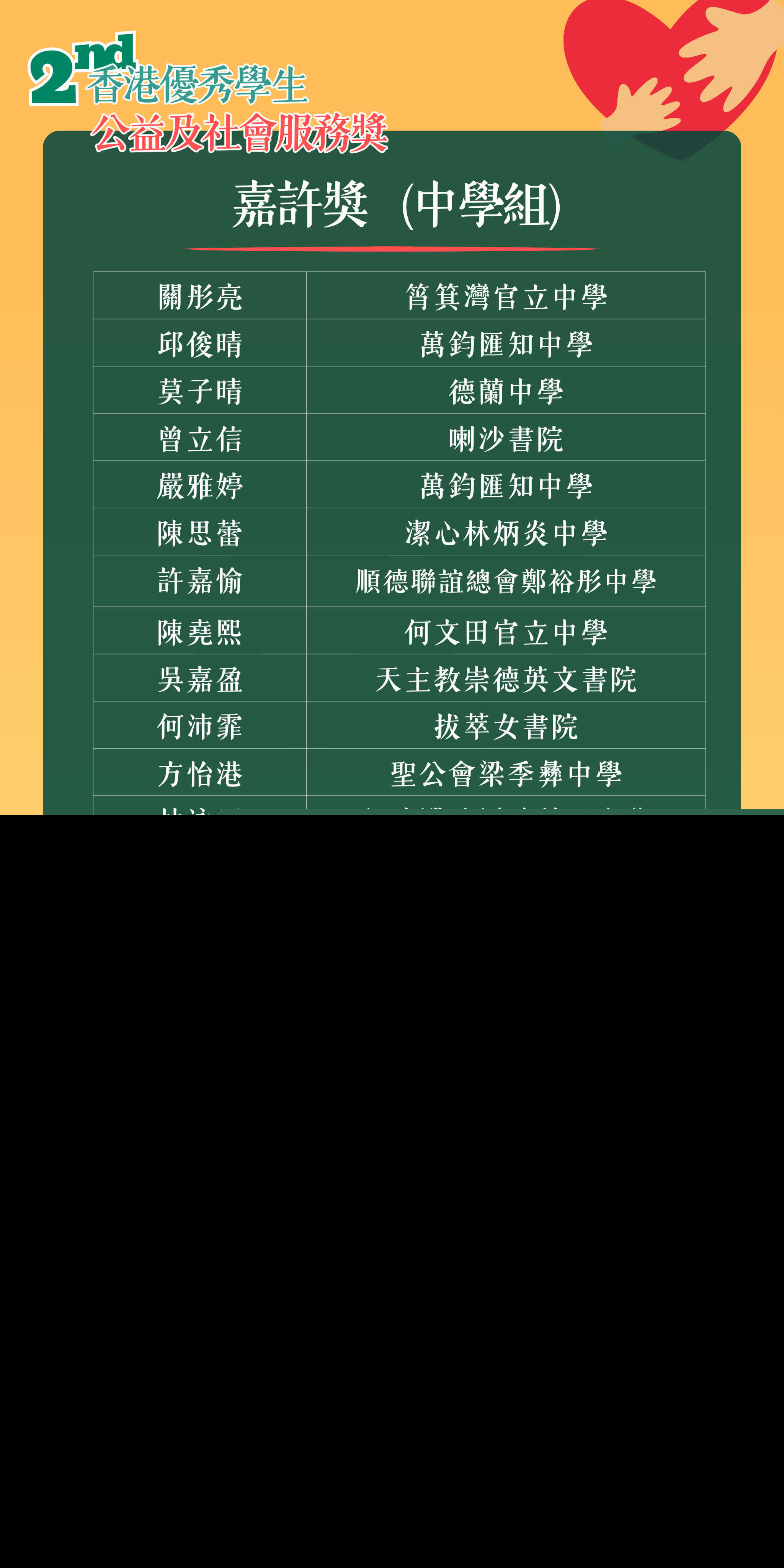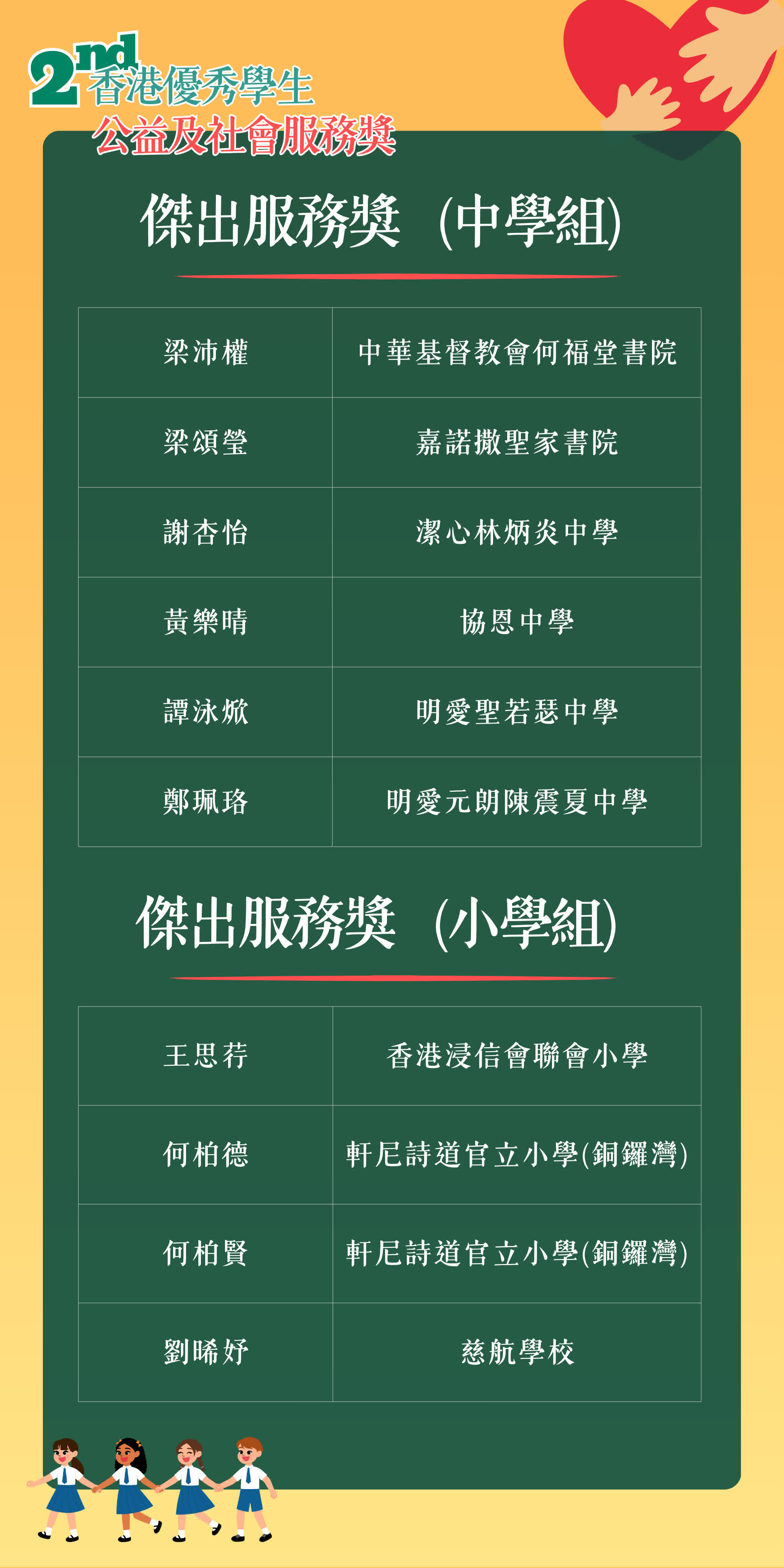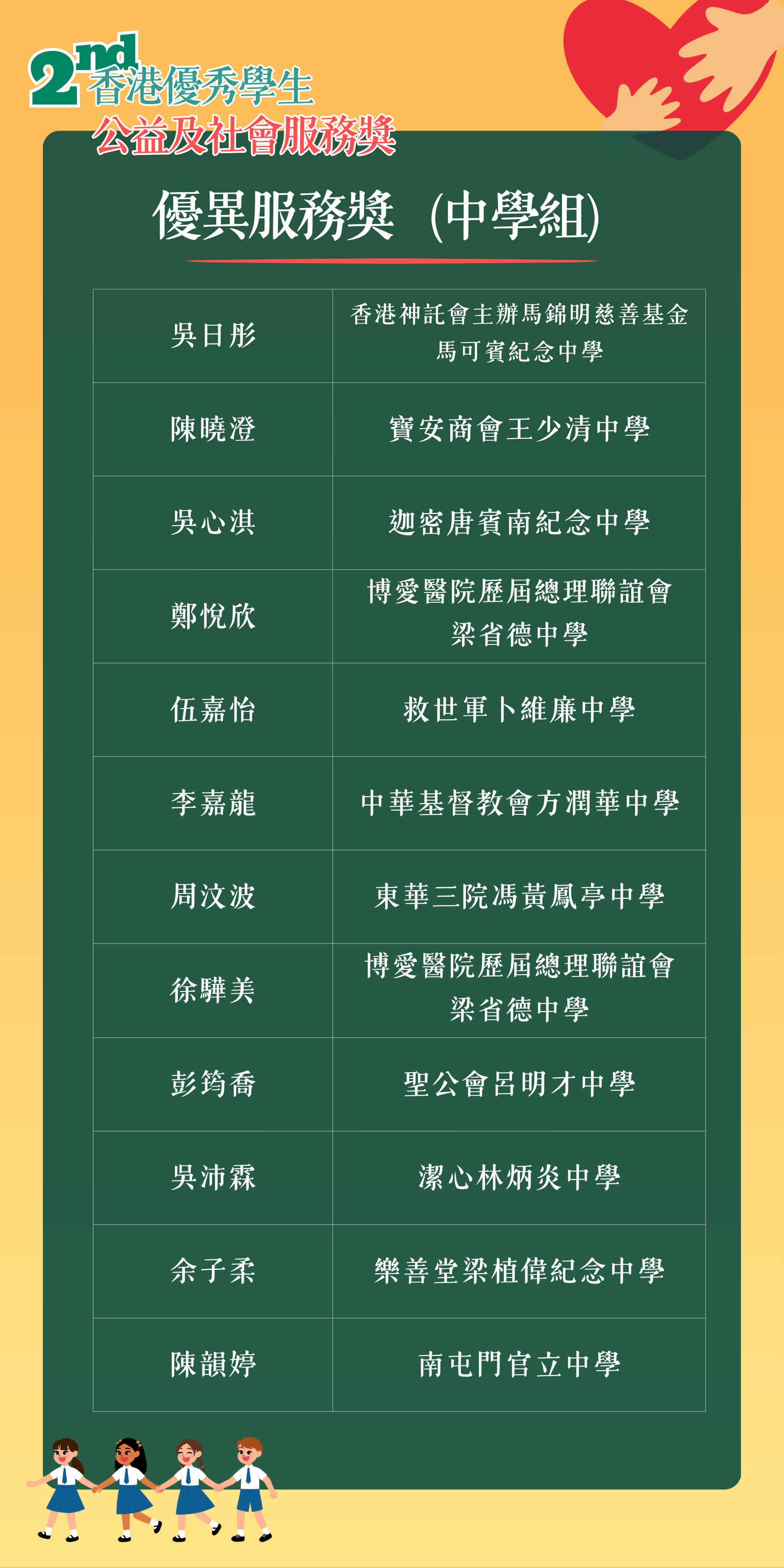 第二屆「香港優秀學生公益及社會服務獎」得獎名單如下: