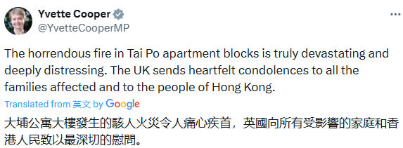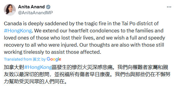 英國外相顧綺慧(Yvette Cooper)在社交網站X說,大埔駭人大火令人痛心疾首,代表英國向所有受影響家庭及港人致以最深切的慰問。加拿大外長阿南德(Anita Anand)說,對大埔火災深感悲痛,向罹難者家屬和親友致以最深切的慰問,祝福所有傷者早日康復。