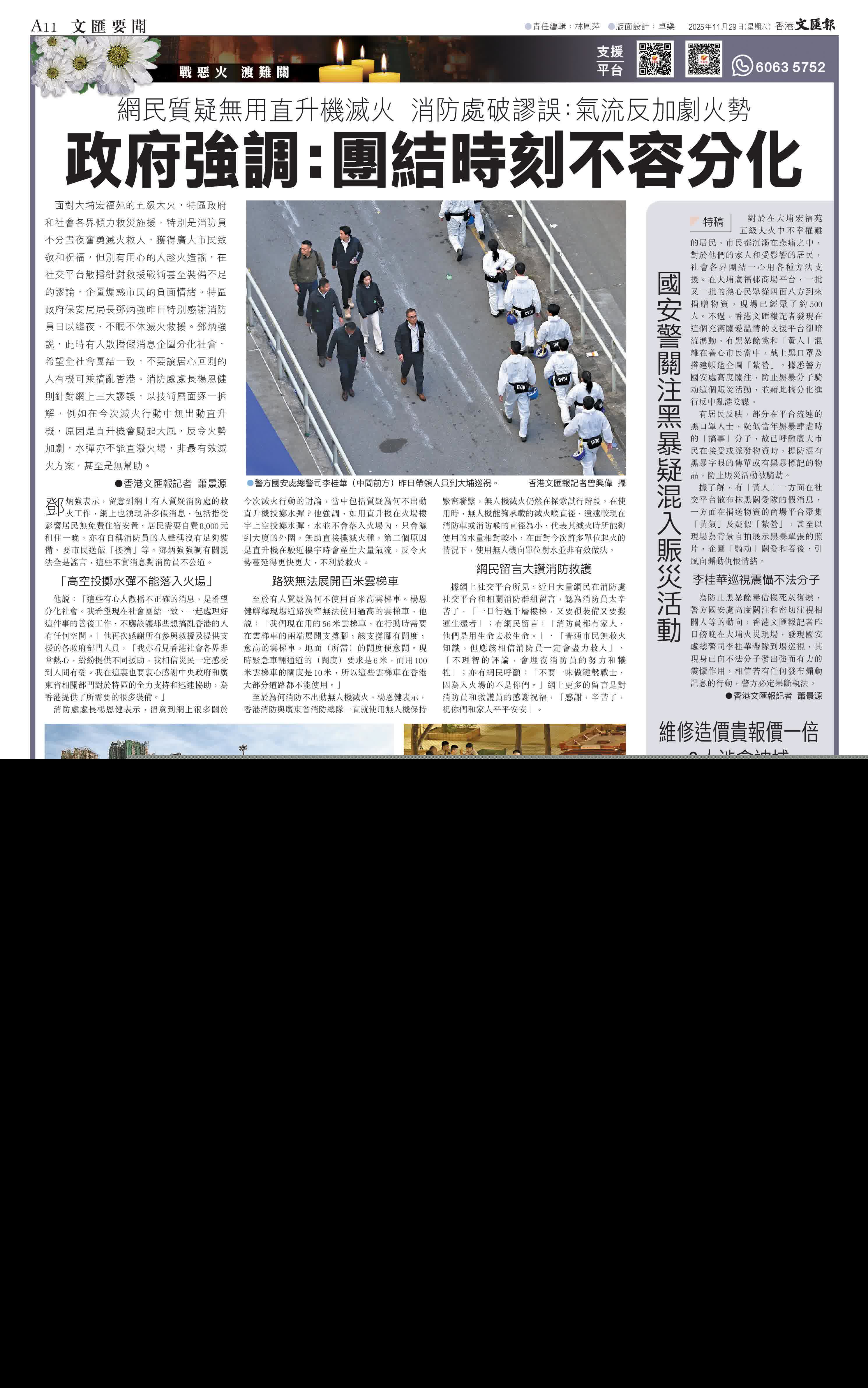 (香港文匯報記者 蕭景源)面對大埔宏福苑的五級大火,特區政府和社會各界傾力救災施援,特別是消防員不分晝夜奮勇滅火救人,獲得廣大市民致敬和祝福,但別有用心的人趁火造謠,在社交平台散播針對救援戰術甚至裝備不足的謬論,企圖煽惑市民的負面情緒。特區政府保安局局長鄧炳強昨日特別感謝消防員日以繼夜、不眠不休滅火救援。鄧炳強說,此時有人散播假消息企圖分化社會,希望全社會團結一致,不要讓居心叵測的人有機可乘搞亂香港。消防處處長楊恩健則針對網上三大謬誤,以技術層面逐一拆解,例如在今次滅火行動中無出動直升機,原因是直升機會颳起大風,反令火勢加劇,水彈亦不能直潑火場,非最有效滅火方案,甚至是無幫助。