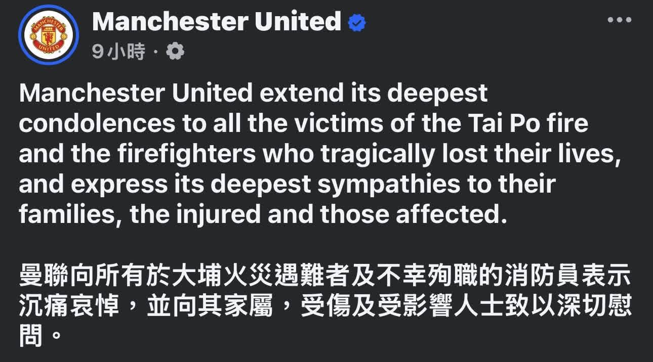 英超球會曼聯在官方社交平台發文,向大埔宏福苑大火致哀。球會以中英文對照發出悼文,表示曼聯向所有大埔火災遇難者及不幸殉職的消防員表示沉痛哀悼,並向其家屬,受傷及受影響人士致以深切慰問。