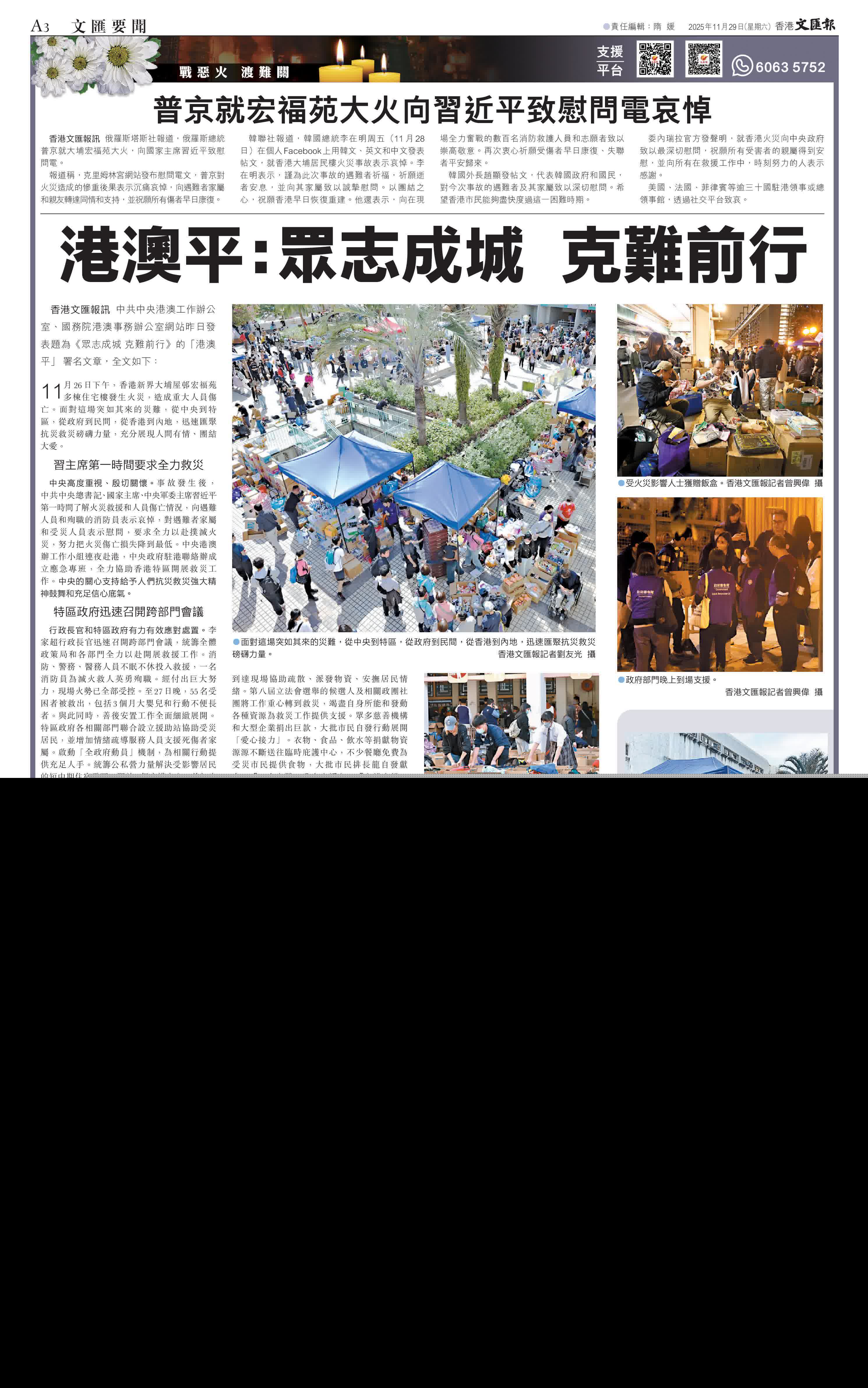 (香港文匯報記者 吳健怡)大埔宏福苑火災牽動無數港人與祖國同胞的心。香港文匯報記者昨日現場所見,在冷風帶來的寒意中,一股股暖流從四面八方湧向大埔廣福商場平台,熱心市民自發運送糧水、毛巾、棉被等物資,支援受影響居民;亦有來自內地的大學生自發組織義工隊,突破語言障礙,深感「災難面前,關心從不需要翻譯。」而這場自發的愛心行動,展現了在災難面前「大愛無疆」的感人精神。