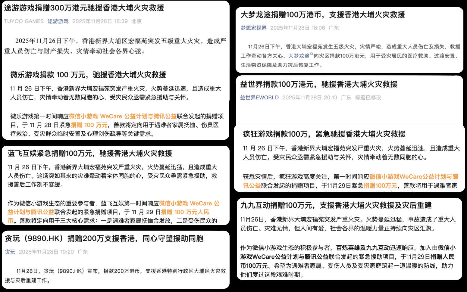 (香港文匯網記者郭若溪)11月26日下午,香港大埔宏福苑發生五級火災,災情嚴峻,牽動各方關心。隨着救援行動持續推進,微信小遊戲開發者們也迅速反應,通過各個渠道貢獻力量,馳援香港。截至11月30日9點,開發者們通過微信小遊戲WeCare公益計劃和其他愛心渠道捐出的善款總額已超過1000萬元。