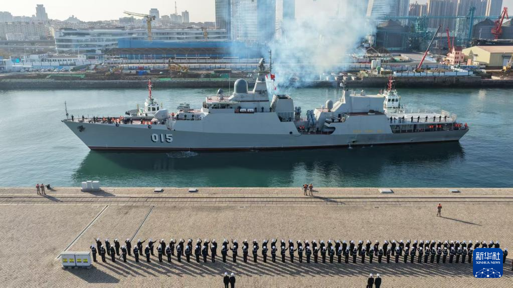 12月1日上午,越南海军“陈兴道”号护卫舰(舷号015)抵达山东青岛某军港码头,开始为期4天的访问交流活动。新华社发(王连涛 摄)
