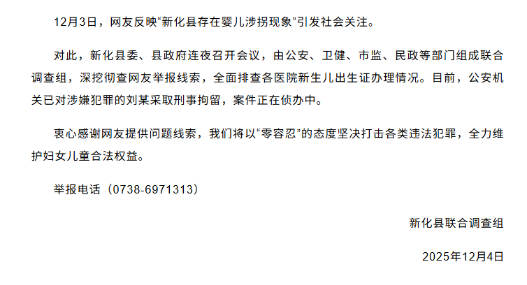 ·湖南新化县通报“存在婴儿涉拐现象”:涉嫌犯罪的刘某已被刑拘。