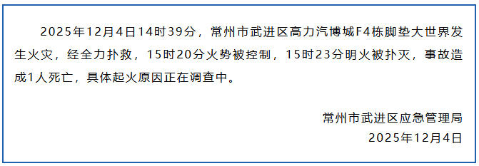 ·江苏常州通报“高力汽博城发生火灾”:明火已被扑灭,事故致1人死亡。