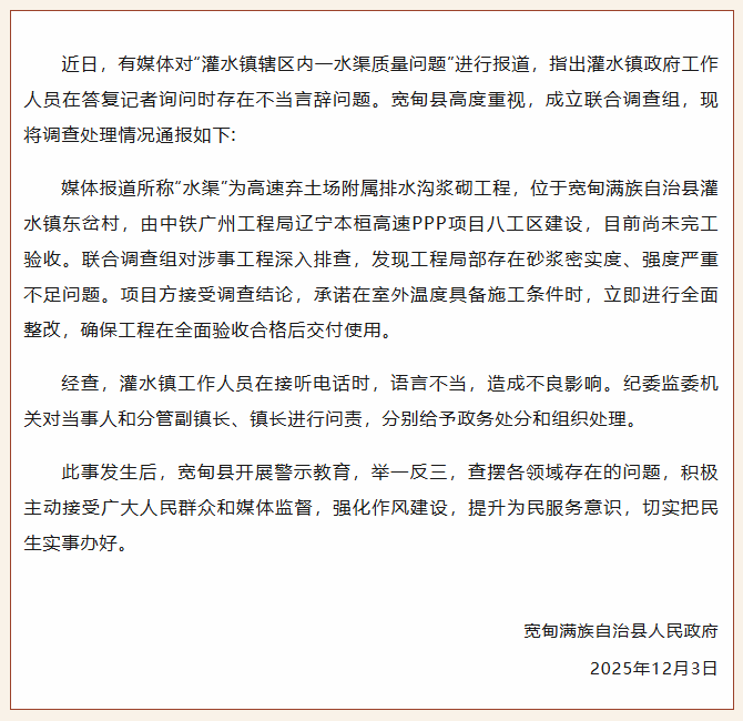 ·官方通报“灌水镇辖区内一水渠质量问题”:项目方承诺进行全面整改。