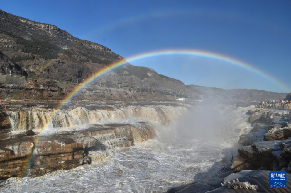 受上游水库调节放水影响,位于山西吉县和陕西宜川县交界处的黄河壶口瀑布水量增大,飞溅的水雾在阳光照射下形成“双彩虹”,吸引了众多游客。