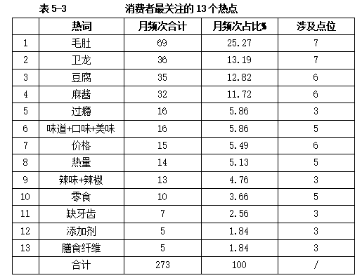 课题组统计计算出消费者关注的出现在3个以上点位(含3个点位)的13个热点,这也是消费者最关注的热点,合计月频次为273次。从关注程度观察,从高到低依次为:毛肚、卫龙、豆腐、麻酱、过瘾、味道+口味+美味、价格、热量、辣味+辣椒、零食、缺牙齿、添加剂和膳食纤维;从关注范围观察,从大到小依次为:毛肚、卫龙、豆腐、麻酱、价格、味道+口味+美味、热量、零食、过瘾、辣味+辣椒、缺牙齿、添加剂和膳食纤维,参见表5-3。
