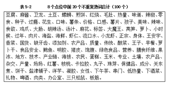 课题组对10个点位进行跟踪监测,并在这个基础上,进一步对消费者关注的每一个点位所涉及的哪些方面和哪些内容进行了更深入的分析。课题组通过设置“热词”来判断消费者具体关注了哪些方面和哪些内容,也就是消费者关注的热点是什么。这个框架的设置和统计分析,提供了另一个观察消费者认知与偏好的视角。通过对8个点位每月前20个热词统计并汇总,有160个热词,排除重复的热词后,共有100个不重复热词,参见表5-2。