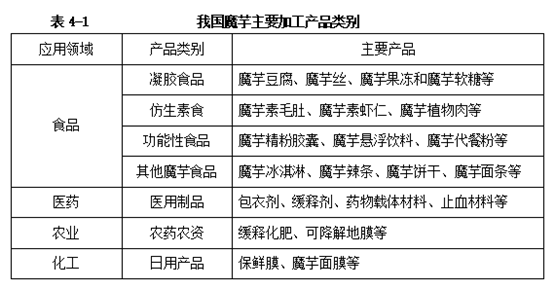 我国真正意义上的魔芋产业化加工始于20世纪80年代,历经40余年发展,我国魔芋加工业已形成“初加工—精深加工”协同发展的完整体系,产品覆盖食品、医药、农业、化工等多个领域,其中食品加工是核心方向,为魔芋产业的市场化、规模化提供关键技术支撑,参见表4-1。