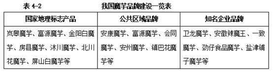 湖北一致魔芋公司为长阳本土企业,专注于魔芋种植、研发、生产和销售,在魔芋精深加工、功能食品开发等领域取得了一系列成果,先后承担了多项国家和省级科技项目,建有省级研发平台3个,拥有有效专利81项,其中发明专利27项,省级科技成果登记5项。云南省富源县金田原农产品公司大力发展绿色阳光产业,走专业化拓展魔芋产业、多元化开发名特优农产品的发展道路,目前,公司已成功开发和销售了“白金芋宝”、“七彩魔坊”“魔乐多”“素悦坊”和“芋腿”等数十个名优农产品品牌和品种。魔芋品牌建设情况参见表4-2。