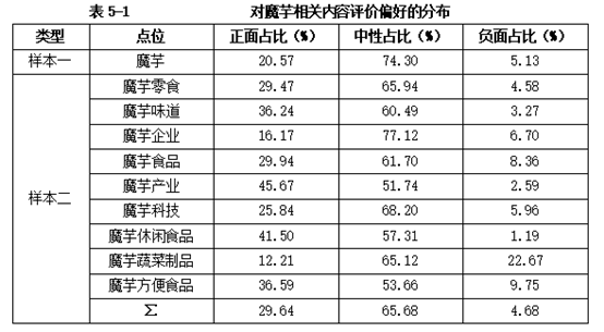 监测和分析显示:在样本一中,消费者对魔芋正面评价的达到20.57%,负面评价为5.13%,正面评价远高于负面评价。在样本二中,消费者对9个点位的评价偏好参见表5-1。