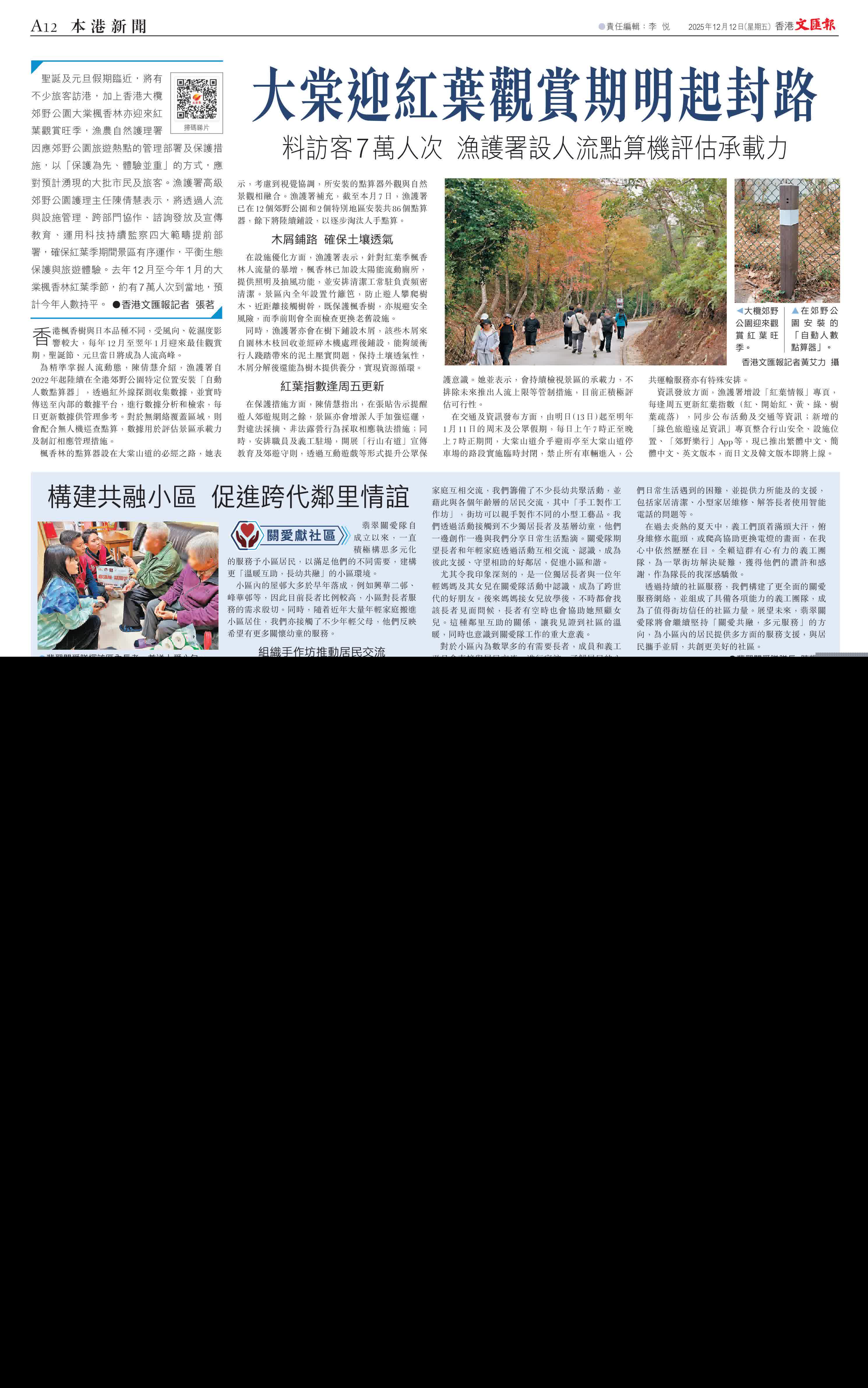(香港文匯報記者 張茗)聖誕及元旦假期臨近,將有不少旅客訪港,加上香港大欖郊野公園大棠楓香林亦迎來紅葉觀賞旺季,漁農自然護理署因應郊野公園旅遊熱點的管理部署及保護措施,以「保護為先、體驗並重」的方式,應對預計湧現的大批市民及旅客。漁護署高級郊野公園護理主任陳倩慧表示,將透過人流與設施管理、跨部門協作、諮詢發放及宣傳教育、運用科技持續監察四大範疇提前部署,確保紅葉季期間景區有序運作,平衡生態保護與旅遊體驗。去年12月至今年1月的大棠楓香林紅葉季節,約有7萬人次到當地,預計今年人數持平。