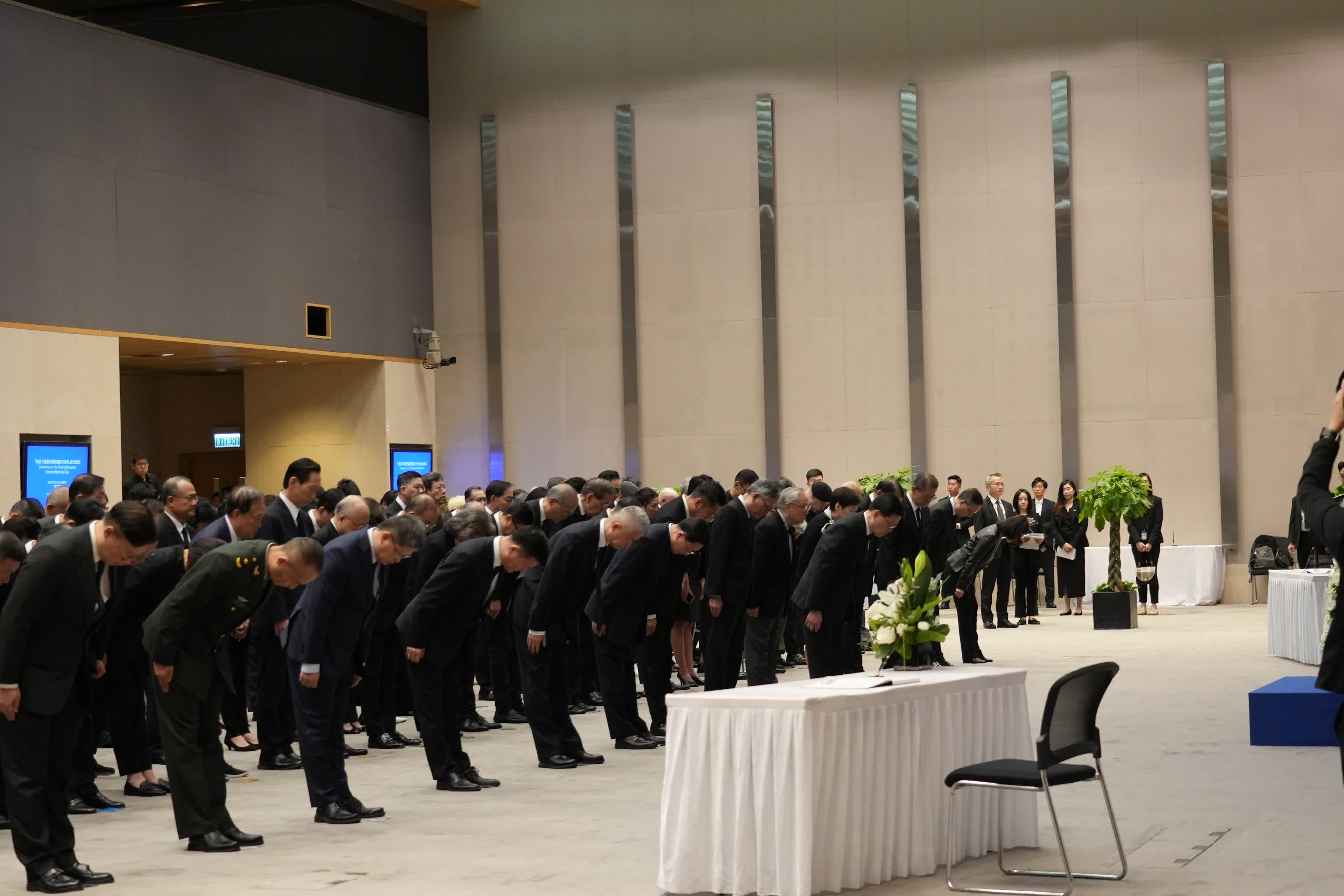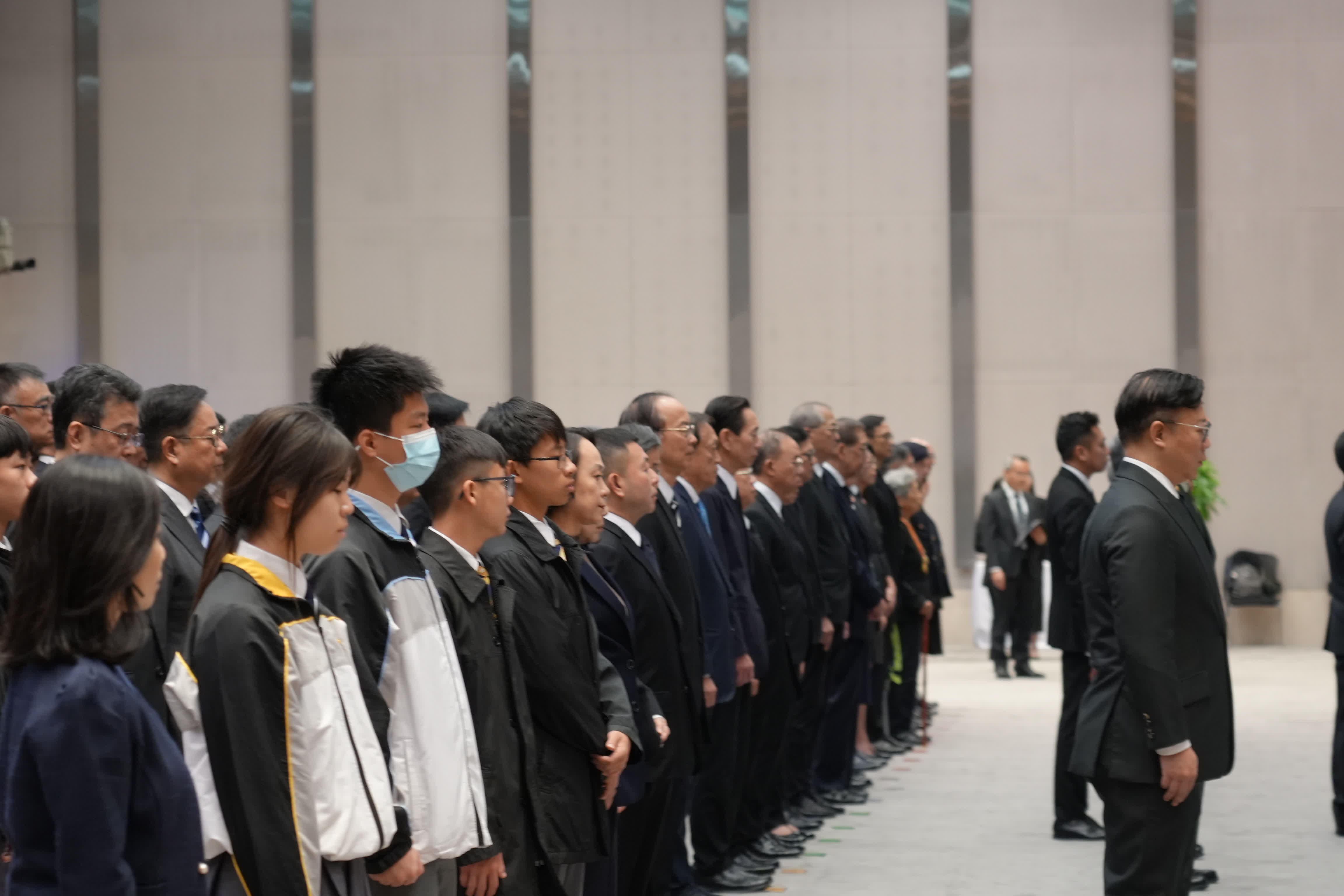 (大公文匯全媒體報道)今日(13日)是南京大屠殺死難者國家公祭日,特區政府舉行「南京大屠殺死難者國家公祭日」儀式。行政長官李家超、中央人民政府駐港機構代表、特區政府主要官員、司法機構代表、原東江縱隊港九獨立大隊老游擊戰士、退伍軍人代表及學生代表等出席儀式。