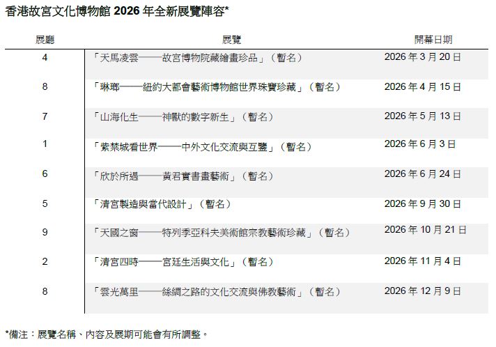 2026年6月3日揭幕的「紫禁城看世界──中外文化交流與互鑒」(暫名)將展現元、明、清時期中國在外交、商貿、科技、思想和工藝等方面的多元交流。2026年9月30日登場的「清宮製造與當代設計」(暫名)則將聚焦清代專門製作及修繕宮廷器用、陳設品等物品的機構「造辦處」,以近200件珍貴文物,呈現「宮廷設計師」們的巧思。展覽亦將邀請香港設計師與藝術家參與,以當代視角連結古今設計和工藝。2026年11月4日登場的「清宮四時──宮廷生活與文化」(暫名)將接棒現時的「紫禁一日——清代宮廷生活」展。王伊悠笑言,看完了皇帝一天的生活,不如轉而來看四季中宮廷生活的樂趣。而將於2026年3月20日亮相的「天馬凌雲──故宮博物院藏繪畫珍品」(暫名)則藉馬年熱潮,不僅展現中國繪畫中的馬,亦展現中外文化交流中的馬。王伊悠透露,展覽亦將以豐富的教育活動,讓觀眾體驗「馬」在生活中的無處不在。