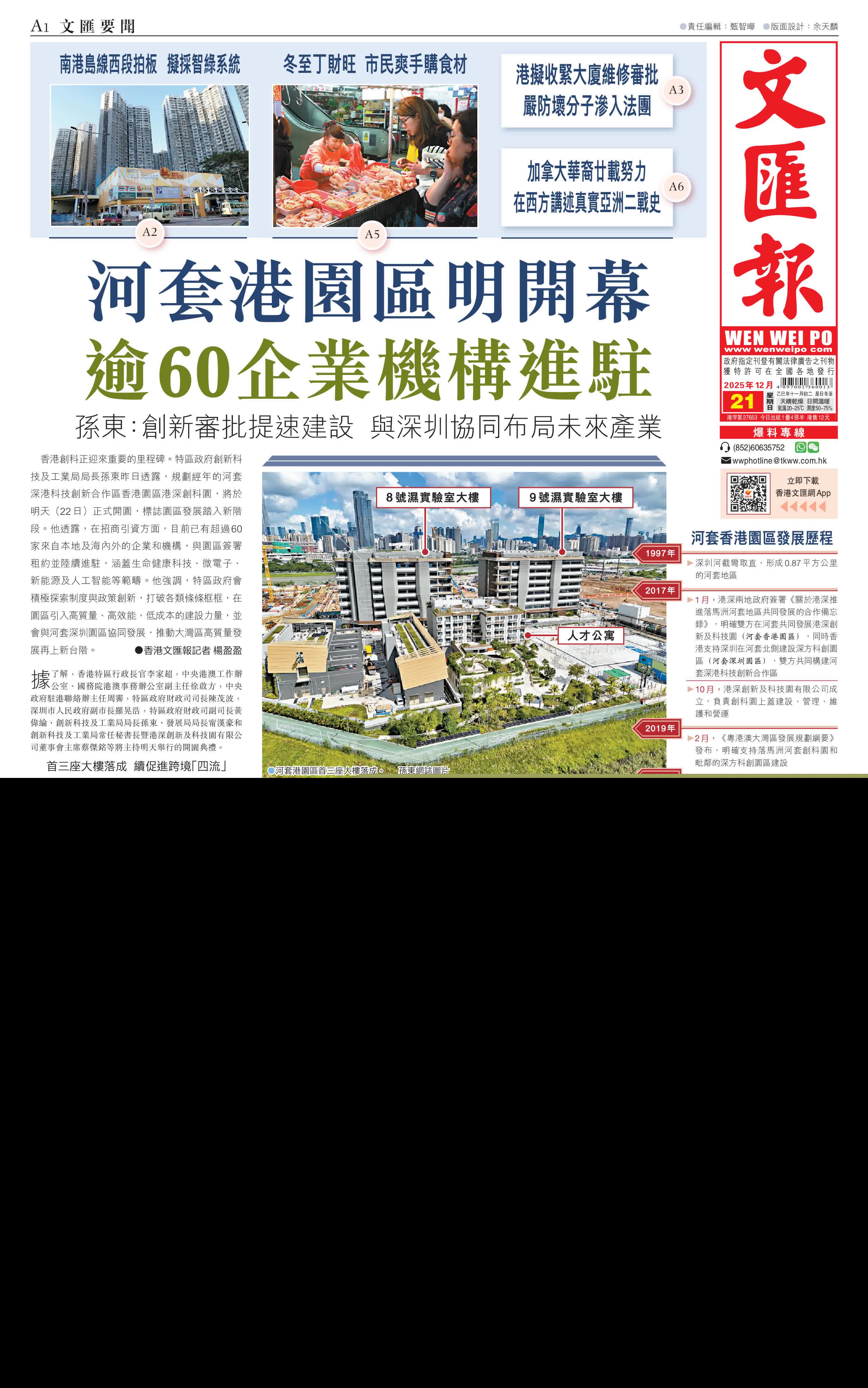 (香港文匯報記者 楊盈盈)香港創科正迎來重要的里程碑。特區政府創新科技及工業局局長孫東昨日透露,規劃經年的河套深港科技創新合作區香港園區港深創科園,將於明天(22日)正式開園,標誌園區發展踏入新階段。他透露,在招商引資方面,目前已有超過60家來自本地及海內外的企業和機構,與園區簽署租約並陸續進駐,涵蓋生命健康科技、微電子、新能源及人工智能等範疇。他強調,特區政府會積極探索制度與政策創新,打破各類條條框框,在園區引入高質量、高效能、低成本的建設力量,並會與河套深圳園區協同發展,推動大灣區高質量發展再上新台階。