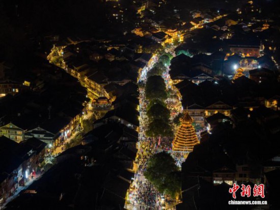 夕阳西下,肇兴侗寨的欢腾并未随暮色消减。千米长桌宴沿主街铺开,四方来客与侗族民众并肩而坐,品尝美食。席间侗族大歌悠扬而起,敬酒歌酣畅相和,笑语声伴着歌声,让古老的待客之道显得格外亲切温暖。(记者 周燕玲)