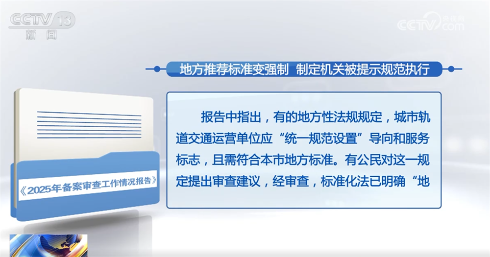 报告中指出,有的地方性法规规定,城市轨道交通运营单位应“统一规范设置”导向和服务标志,且需符合本市地方标准。有公民对这一规定提出审查建议,经审查,标准化法已明确“地方标准是推荐性标准”,这一规定实践中有可能造成通过地方立法将地方推荐性标准变为强制性标准的理解,审查机构已提示制定机关做好法规宣传解读,按照标准化法执行相关规定。
