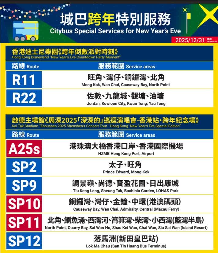 城巴將於跨年夜為四大主要場館增設 13 條散場路線疏散人流,助市民及旅客參與大型活動後,輕鬆前往香港島、九龍及新界、機場及主要陸路口岸,包括迪士尼樂園散場路線R11 及 R12;啟德體育園散場服務:城巴機場快線 A25s(前往港珠澳大橋香港口岸及機場)、SP2、SP9、SP10、SP11 及 SP12(前往落馬洲新田皇巴站)號線;香港體育館散場路線 50R 及 796R;以及亞洲國際博覽館散場服務:城巴機場快線 NA11、NA20 及NA29,更多服務詳情請參閲宣傳海報。