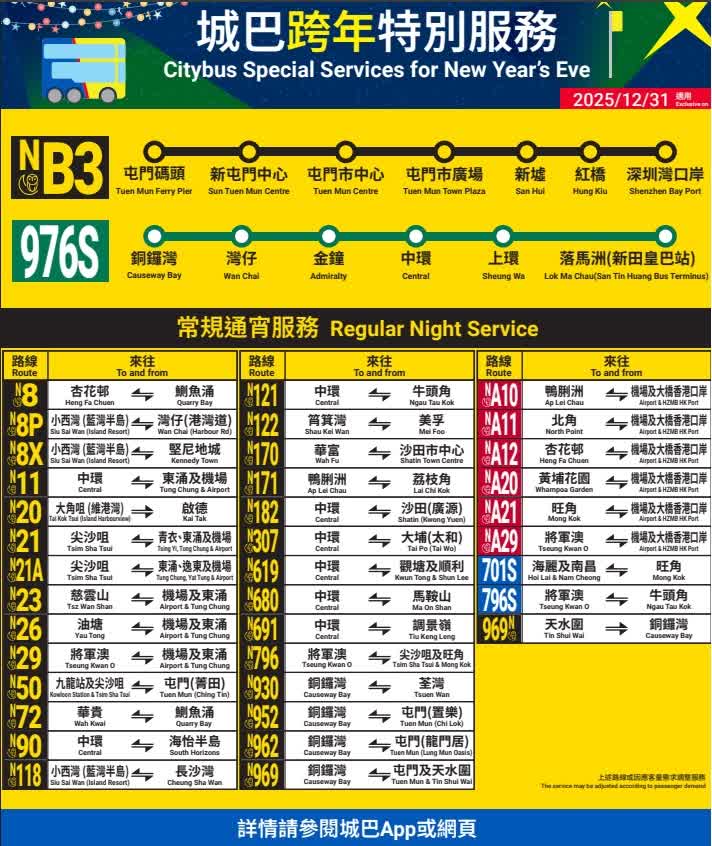 因應旅發局將於中環舉辦跨年倒數活動,城巴額外開辦特別路線 976S,提供由港島銅鑼灣、灣仔、金鐘、中上環前往落馬洲新田皇巴站的班次。旅客於中環體驗跨年倒數氣氛後,可於滙豐總行大廈巴士站乘搭 976S 號線,輕鬆前往落馬洲新田皇巴站。另外,城巴近 40 條常規通宵路線亦將按客量需求適時加強服務,助乘客於各區參與倒數活動後,無縫穿梭市區、機場及主要陸路口岸,重點加強服務路線包括:X15、N8X、N72、N90、N118、N121、N122、N619 及 N691 號線。