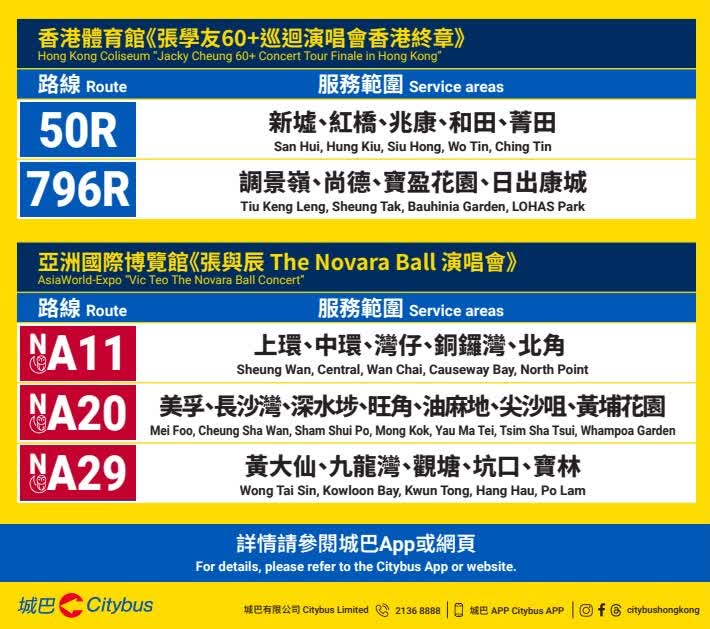 城巴持續照顧大型節日期間市民及旅客的交通需求,將密切留意跨年夜的交通情況,部署額外前線人手協助乘客,並靈活調動後備車隊資源,以疏導各主要場館及各陸路口岸人流。如有查詢,可瀏覽城巴網頁 www.citybus.com.hk 或下載城巴手機應用程式,掌握有關路線的最新乘車資訊,及獲取最新消息。