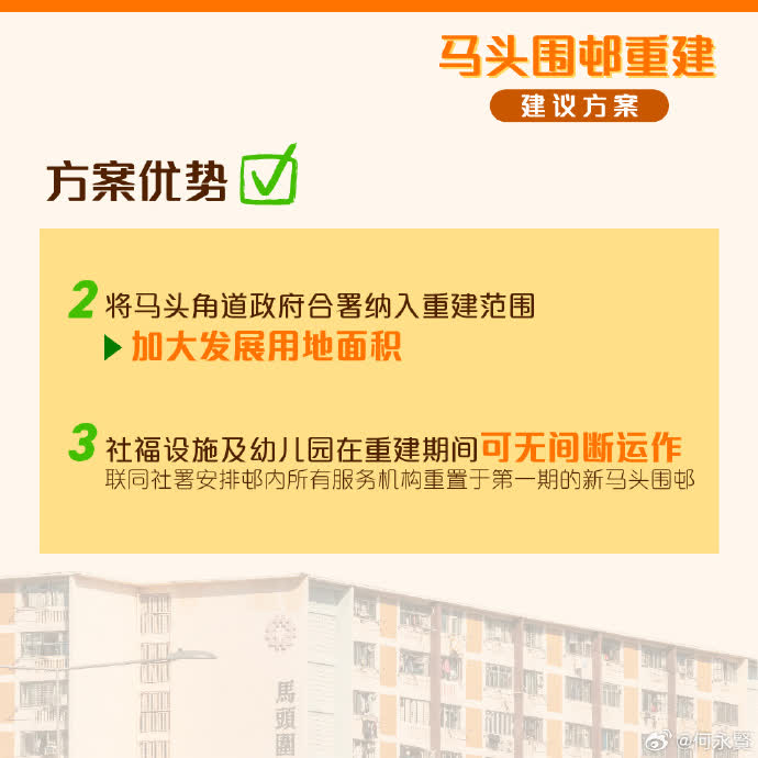 她表示在馬頭圍邨方面,原本2075個單位的屋邨,重建後單位數量可以達到約4000個單位,近乎翻倍!為加速進度及善用土地,建議在土瓜灣道公營房屋發展項目以外,將部分新美東邨公營房屋發展項目加入用作遷置資源,令3期的重建期數縮短至2期,而搬遷全部居民的時間亦由14年大幅縮減至7年;將馬頭角道政府合署納入重建範圍,以加大發展用地面積;及在重建期間維持社福設施及幼兒園無間斷運作。