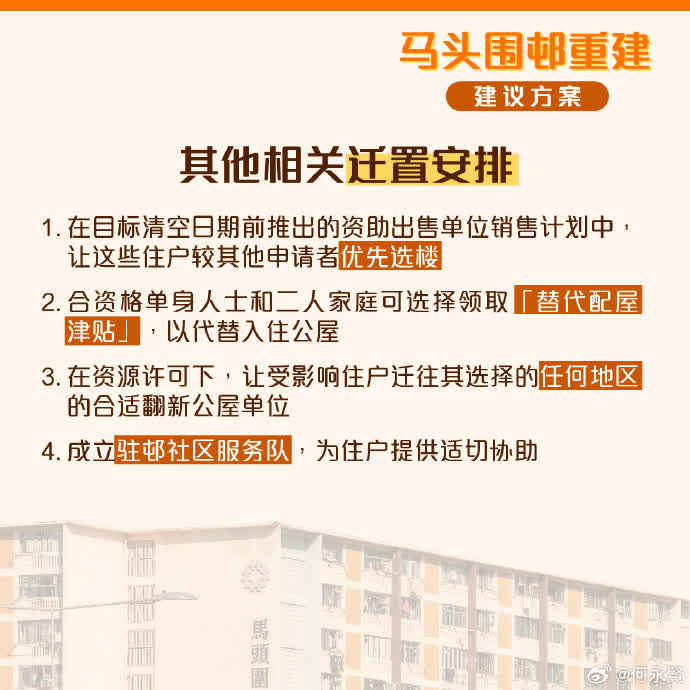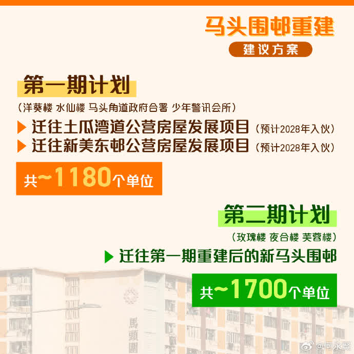 房屋局局長何永賢今日(30日)在社交平台表示,經過房署同事舉辦一系列的社區參與活動,包括工作坊、問卷收集、居民通訊等以了解社區看法後,今日分別向九龍城區議會提交馬頭圍邨的重建建議方案,及向中西區區議會提交西環邨重建建議方案。