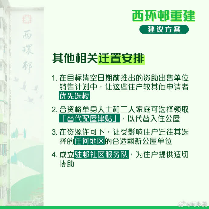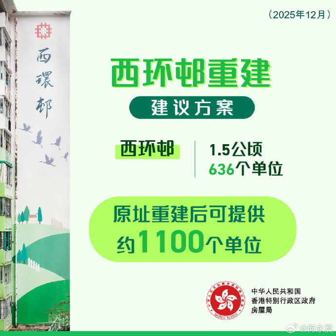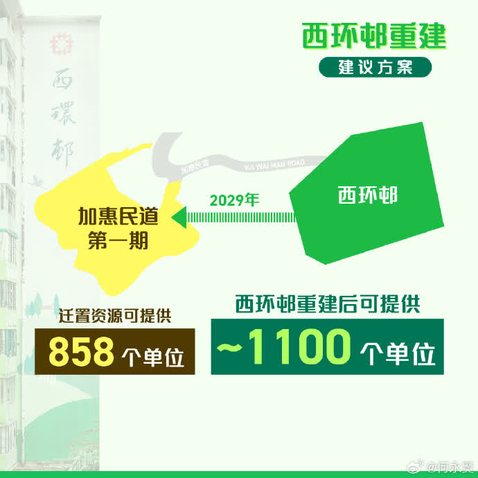 她還表示,至於西環邨方面,原本636個單位的屋邨,重建後單位數量可增加逾70%至約1100個單位。受影響的住戶可全數遷至加惠民道第一期公屋單位,預計可於2029年入伙。