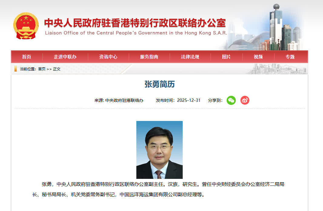 中央人民政府駐香港特別行政區聯絡辦公室網站公開的簡歷顯示,張勇,漢族,研究生。曾任中央財經委員會辦公室經濟二局局長、秘書局局長、機關黨委常務副書記,中國遠洋海運集團有限公司副總經理等。
