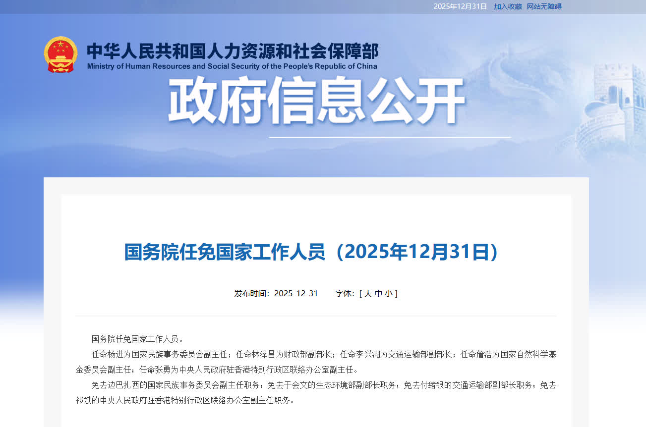 據人社部網站12月31日消息,國務院任免國家工作人員。
