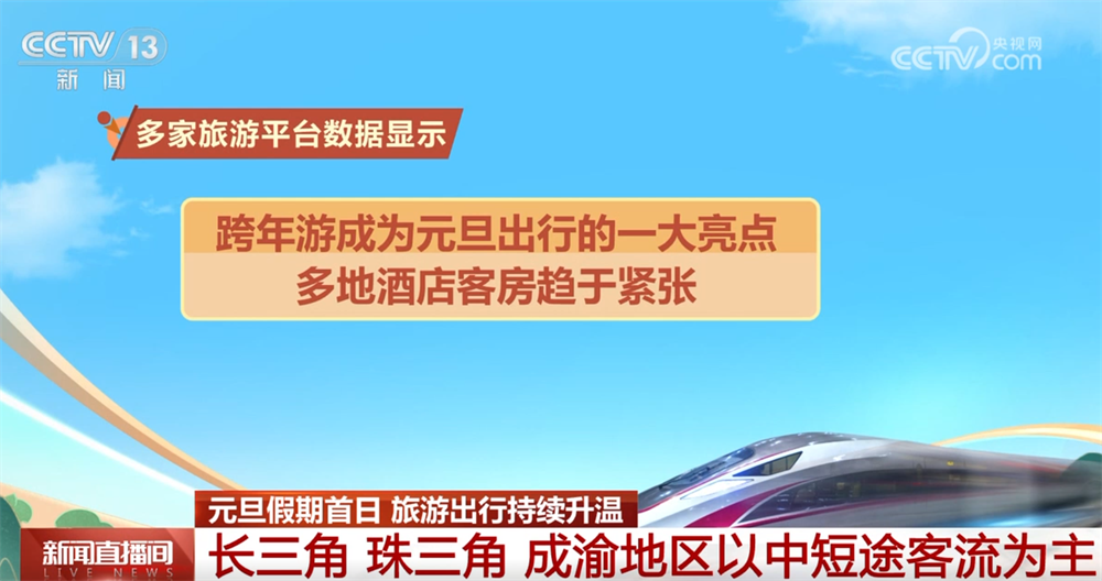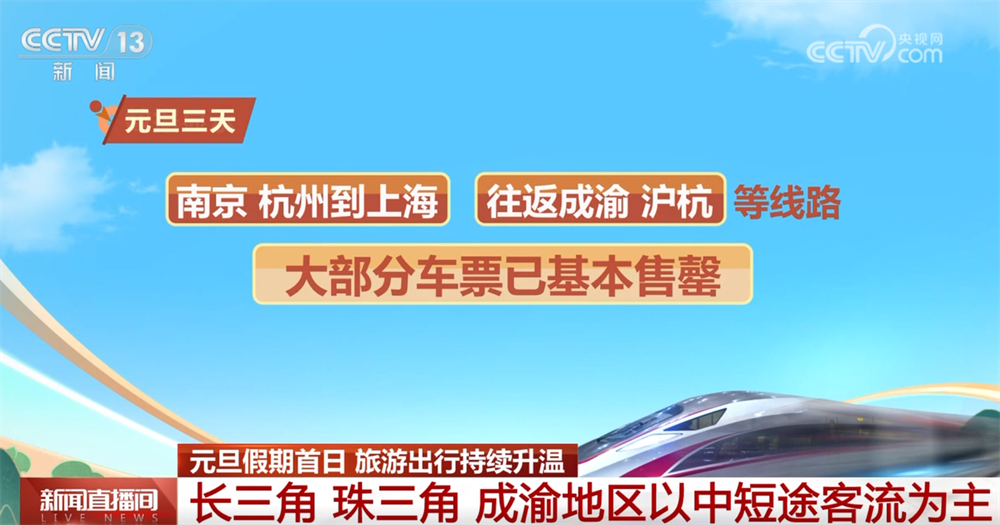 数据显示,长三角、珠三角、成渝地区节日期间以中短途出行为主,元旦三天,南京、杭州到上海以及往返成渝、沪杭等线路大部分车票已基本售罄。多家旅游平台数据显示,跨年游成为元旦出行的一大亮点,多地酒店客房趋于紧张。