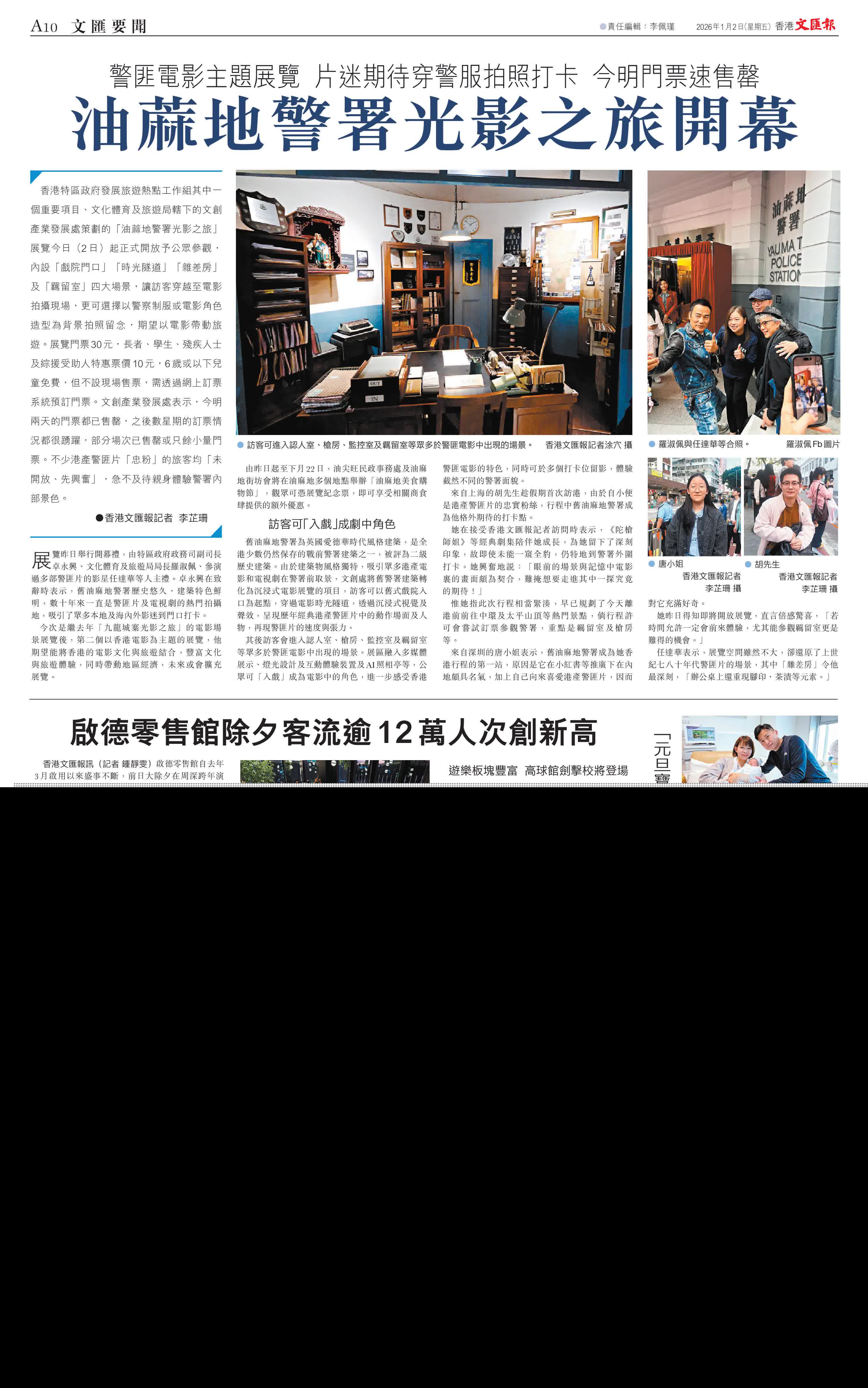 (香港文匯報記者 李芷珊)香港特區政府發展旅遊熱點工作組其中一個重要項目、文化體育及旅遊局轄下的文創產業發展處策劃的「油蔴地警署光影之旅」展覽今日(2日)起正式開放予公眾參觀,內設「戲院門口」「時光隧道」「雜差房」及「羈留室」四大場景,讓訪客穿越至電影拍攝現場,更可選擇以警察制服或電影角色造型為背景拍照留念,期望以電影帶動旅遊。展覽門票30元,長者、學生、殘疾人士及綜援受助人特惠票價10元,6歲或以下兒童免費,但不設現場售票,需透過網上訂票系統預訂門票。文創產業發展處表示,今明兩天的門票都已售罄,之後數星期的訂票情況都很踴躍,部分場次已售罄或只餘小量門票。不少港產警匪片「忠粉」的旅客均「未開放、先興奮」,急不及待親身體驗警署內部景色。