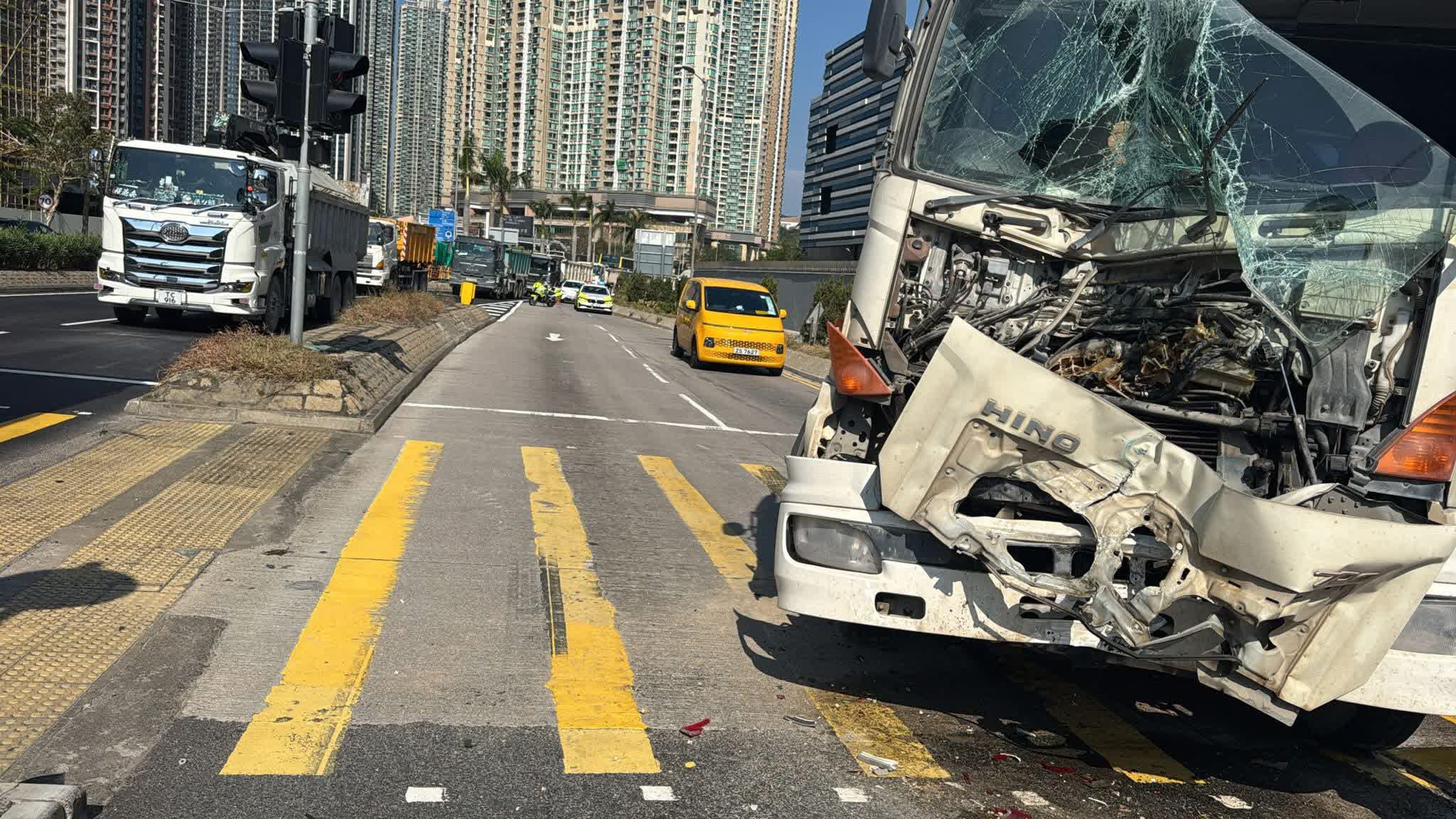 警方封鎖現場,肇事泥頭車擋風玻璃破裂,車頭嚴重毀爛,旁邊交通燈亦告損毀,意外原因及經過有待進一步調查。