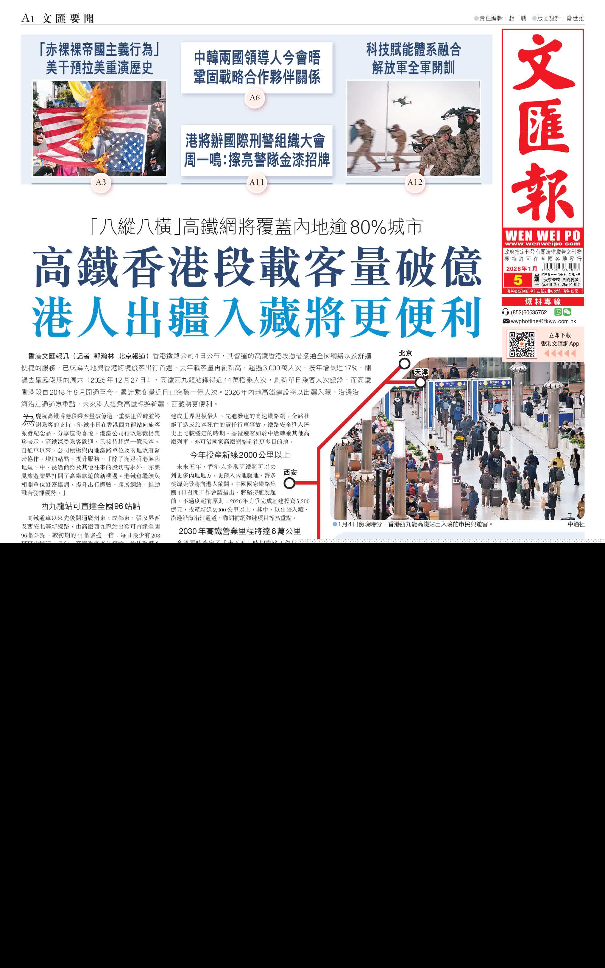 香港文匯報訊(記者 郭瀚林 北京報道)香港鐵路公司4日公布,其營運的高鐵香港段憑借接通全國網絡以及舒適便捷的服務,已成為內地與香港跨境旅客出行首選,去年載客量再創新高,超過3,000萬人次,按年增長近17%,剛過去聖誕假期的周六(2025年12月27日),高鐵西九龍站錄得近14萬搭乘人次,刷新單日乘客人次紀錄,而高鐵香港段自2018年9月開通至今,累計乘客量近日已突破一億人次。2026年內地高鐵建設將以出疆入藏、沿邊沿海沿江通道為重點,未來港人搭乘高鐵暢遊新疆、西藏將更便利。