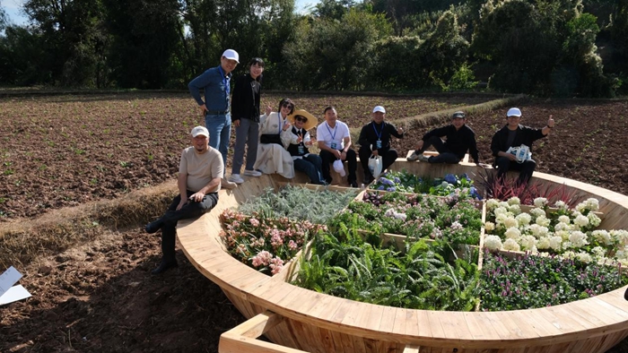 有几位艺术家本次就不约而同的以美食特色出发进行在地创作,潘曦团队的《四季》将当地特色食物进行陶瓷翻制,用青色釉展现食物四季常青,将餐桌化作卷轴从天而降表达食物天赐的概念,放置在田陇四季变化之中;而我,由于曾在川渝地区生活学习了八年,对川渝地区的特色火锅情有独钟,因此在这片土地上建造了一座“空”的巨型九宫格火锅,保留土壤原有的“农耕”功能,将不同颜色的农作物分别种植进九宫格中,区分颜色的灵感来源于当地有五彩水稻和五彩油菜花的种植习惯。而起名《酸豁咯儿》的原因则是在拟音川渝地区方言——“涮火锅”,火锅中的“食材”,会跟随当地种植习惯四季更替。在制作过程中,当地居民常常围聚在我的火锅旁,热烈地讨论着,他们的奇思妙想如泉涌般不断涌现。有的希望下一个火把节能在这锅上烧起熊熊火焰,有的提议把锅把连接到路边做成桥,方便大家轻松走进锅里打卡留念。他们的热情与质朴,让我深深感受到了这片土地的温暖与活力;吴丽云作品《新生》也是由水稻种子的形象出发,制作过程中也发生了很多温暖人心的事情,她会怕工人太累给他们买咖啡,下水安装的时候担心他们冷,工人也会安慰她“这和下水摸鱼是一样的”。她和门琬凝还给其中一位师傅起了“儒雅师傅”的外号,因为那位师傅讲话文绉绉的,做事也很讲究,在借用别人的东西之后,一定会洗的很干净的还给人家,有头有尾。她作品中途出现问题,他们也会陪她半夜加班,还说“这是给我们家乡的作品,我要认真对待。”,并且表示会带小孩来看爸爸参与的作品。我记得,吴丽云回宿舍的时候是哭着和我说的这些事,这份温暖交互,对于一位驻地创作者来说,远比作品本身更加珍贵。